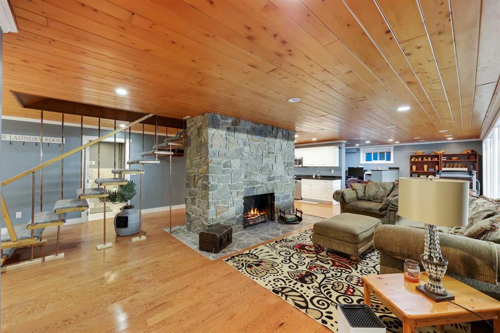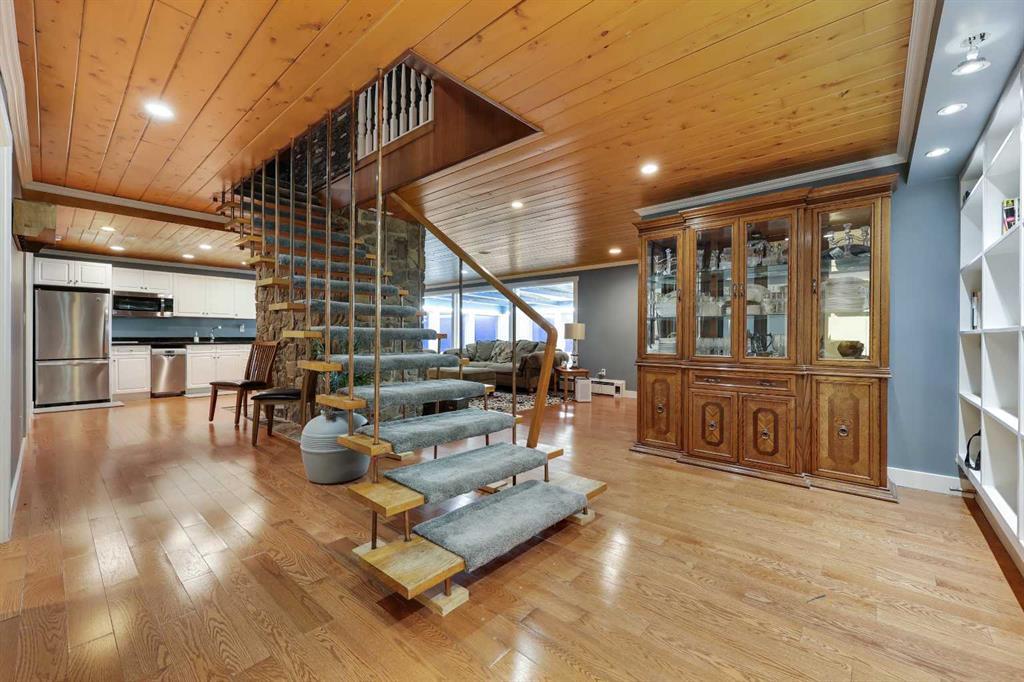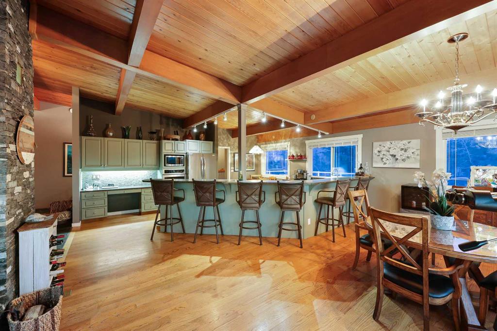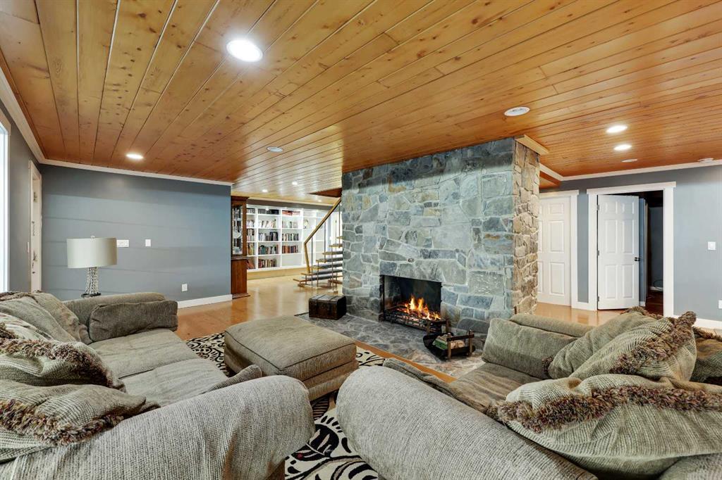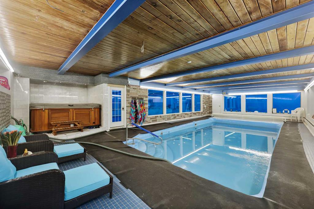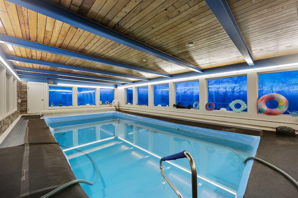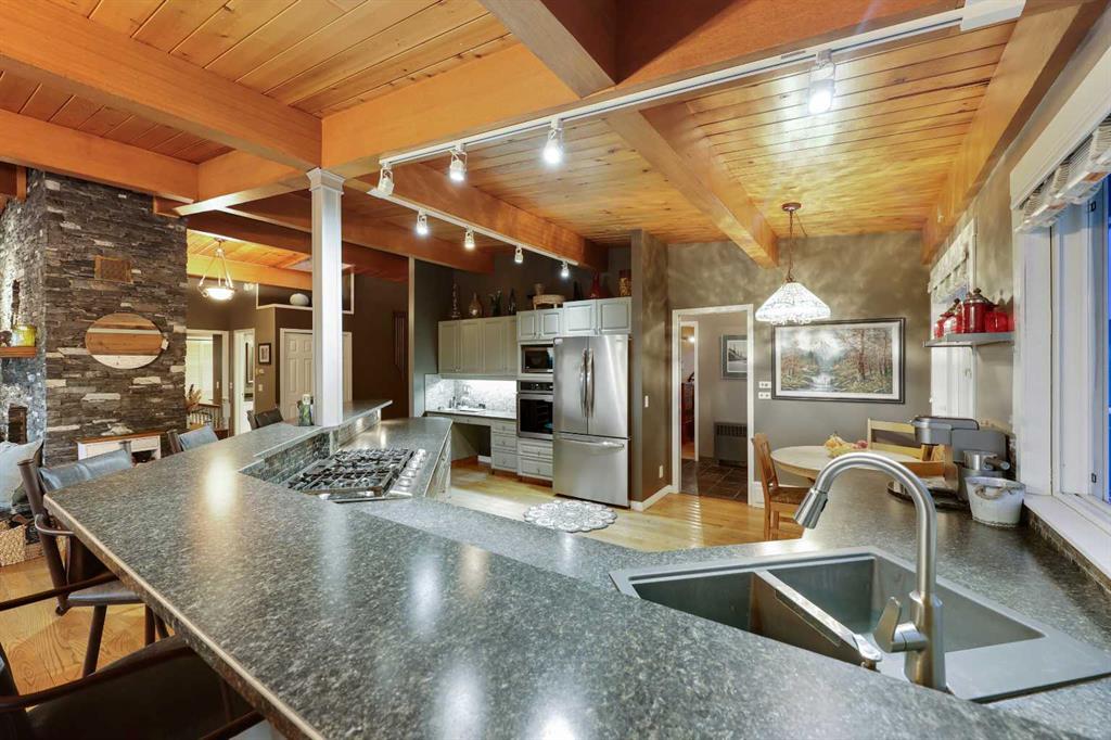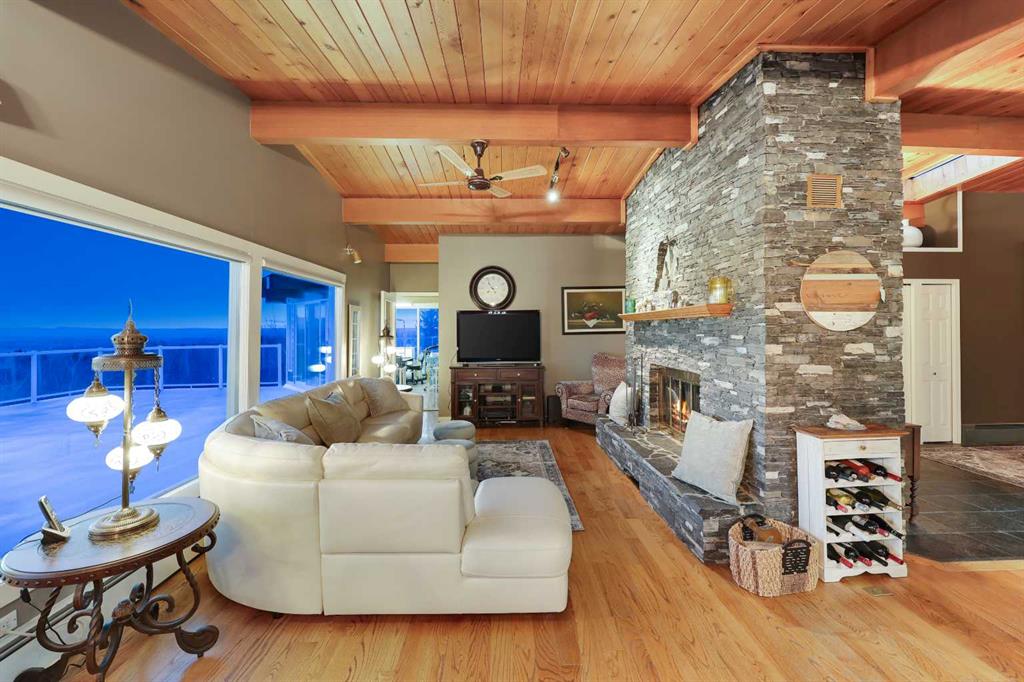 Set on a serene, private lot with unobstructed mountain views, this exceptional walkout bungalow offers timeless design, generous space, and the opportunity to make it your own—all within one of Springbank’s most sought-after communities, just minutes from West Springs, Aspen Landing, top schools, and recreation. Offering nearly 5,000 sq ft of living space, the home features 4 bedrooms, 3 bathrooms, and a separate-entry illegal suite, ideal for extended family or added flexibility. The main level showcases slate and oak hardwood flooring, soaring ceilings with exposed mahogany-wrapped beams, and a dramatic floor-to-ceiling, two-sided wood-burning stone fireplace framed by expansive triple-pane windows. The chef’s kitchen includes stainless steel appliances, ample seating, a breakfast nook, and formal dining, with easy access to a spacious composite BBQ deck—perfect for entertaining while enjoying the mountain backdrop. The primary suite is a private retreat with a 5-piece ensuite, walk-in closet, cedar storage, and a sunroom opening to multiple outdoor decks—ideal for morning coffee or evening sunsets. The walkout lower level offers excellent versatility with a guest bedroom, office, second kitchen, inviting living room with a matching stone fireplace, and a recreation wing featuring a refinished indoor pool and hot tub, surrounded by windows for year-round enjoyment. Additional highlights include a heated triple oversized garage, custom matching shed, firepit area, and a charming two-story playhouse nestled among the trees. A rare offering combining privacy, views, and the flexibility to personalize a truly timeless home in one of Springbank’s most prestigious enclaves.