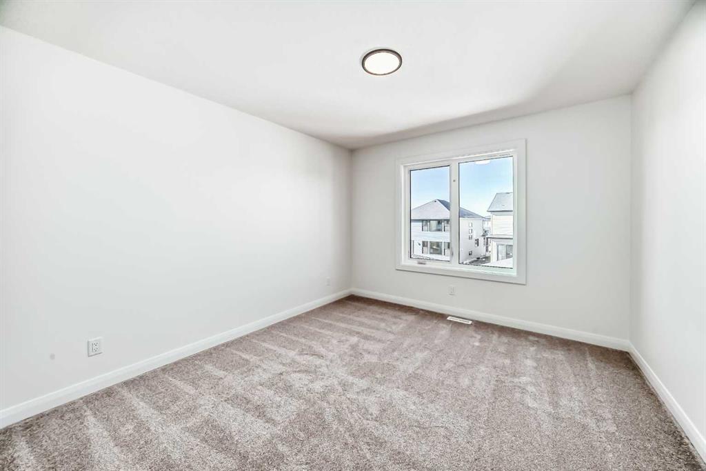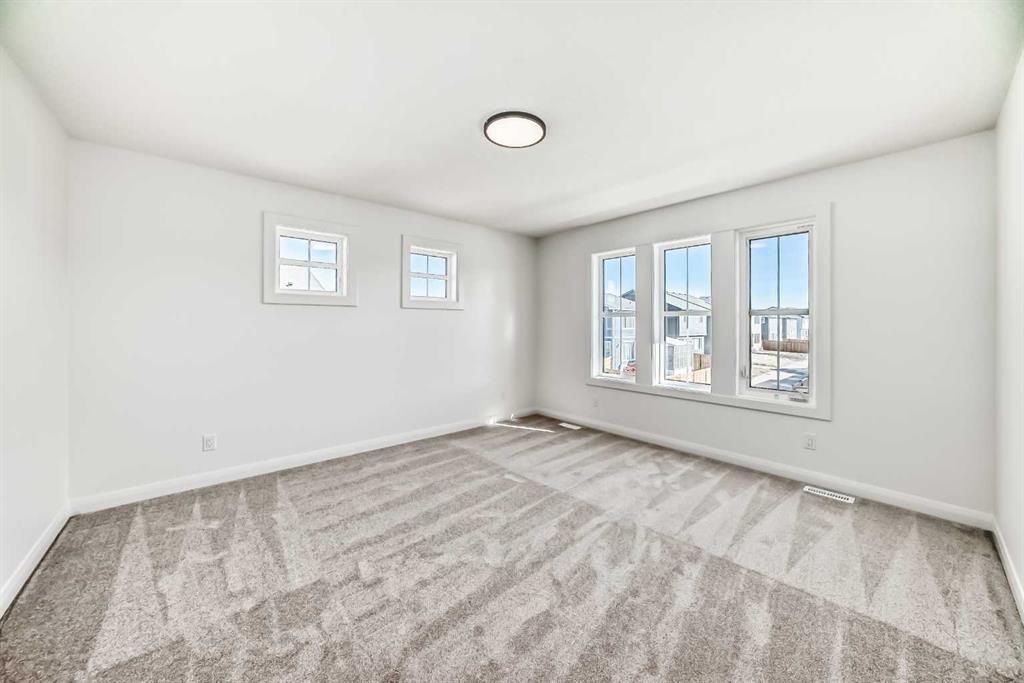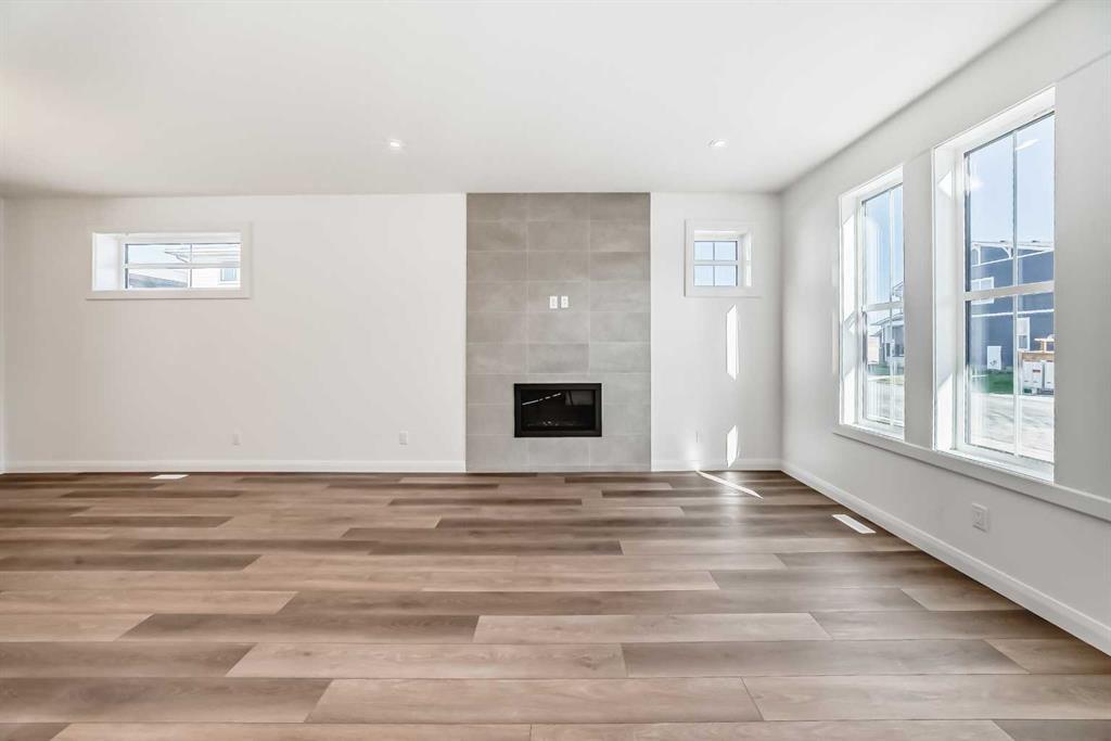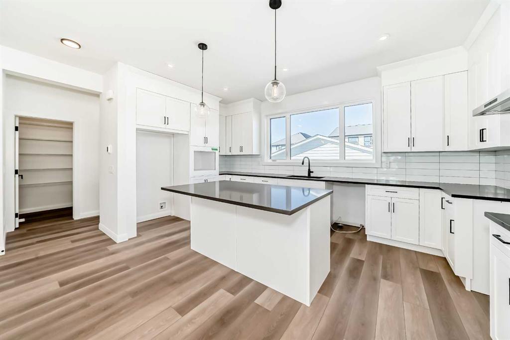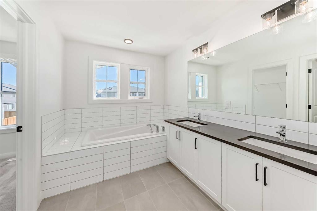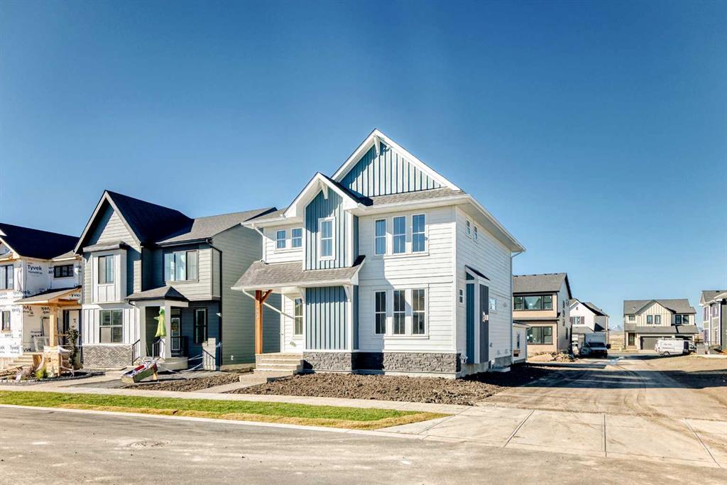 Brand new and move-in ready! This 2,082 sq. ft. Broadview Homes build blends timeless style with thoughtful upgrades. The main floor offers a flexible front room ideal for an office and a sunlit living room with a stylish gas fireplace. The bright white kitchen features quartz counters and 42" upper cabinets finished to the ceiling with crown moulding. The stainless-steel appliance package includes a gas range, dishwasher, hood fan, and built-in microwave. A large walk-in pantry keeps everyday essentials organized. Upstairs you’ll find three bedrooms and two baths, including a primary retreat with a walk-in closet with a window and a luxurious 5-piece ensuite with double vanity, soaker tub, and roomy tiled shower. The lower level features 9' ceilings and is unfinished, ready for your design, with rough-in for a future bathroom. The west-facing backyard offers a 10' x 18' deck and a concrete sidewalk to the oversized double garage, providing ample parking and storage. Additional perks include rough-in for central vacuum. Set within Harmony, a sought-after lake community and bedroom community of Calgary, you are moments from parks, pathways, golf, and everyday amenities.