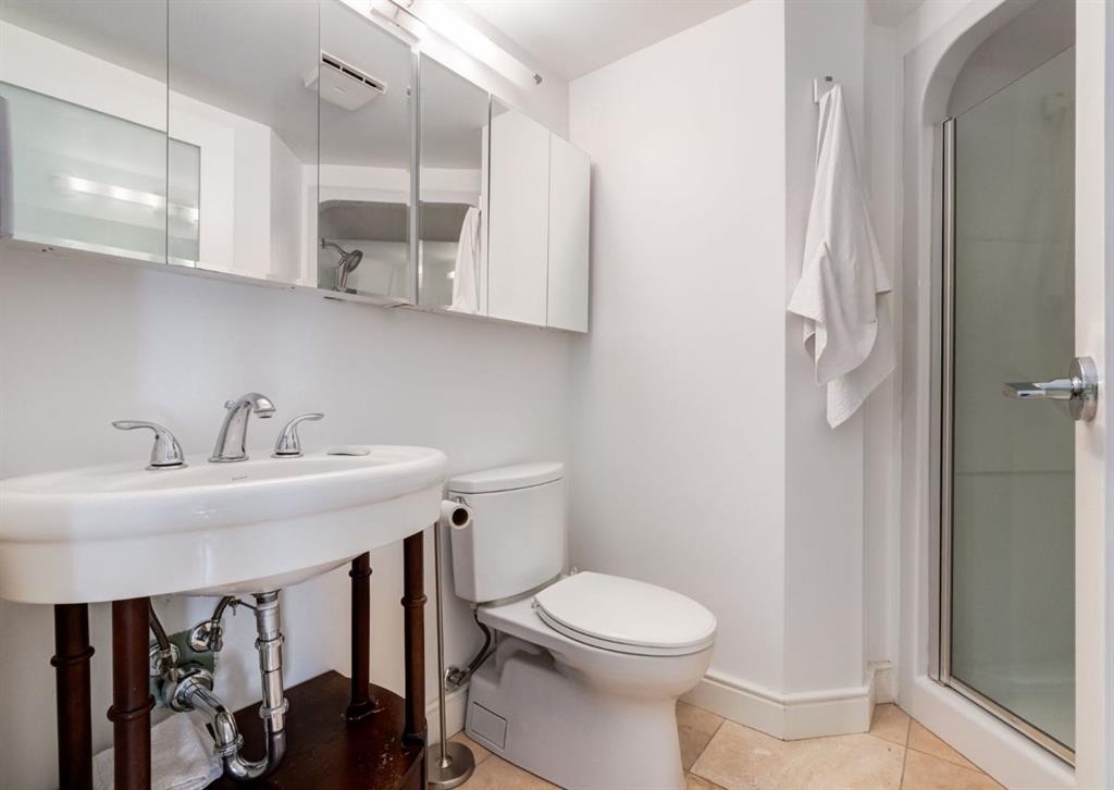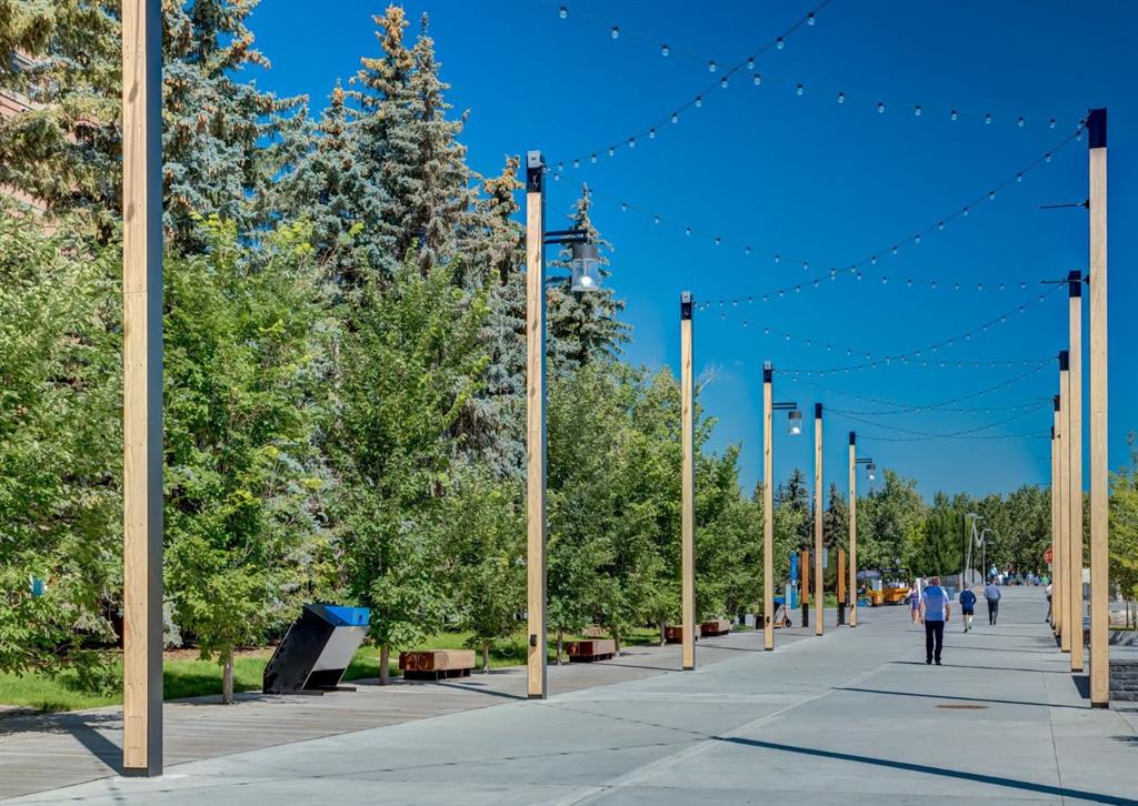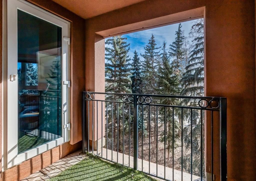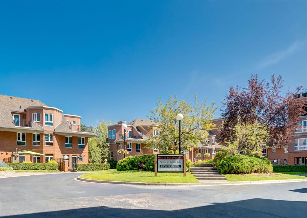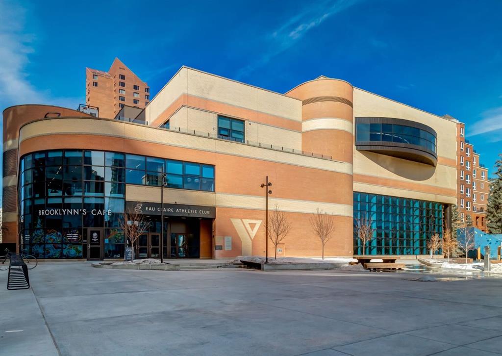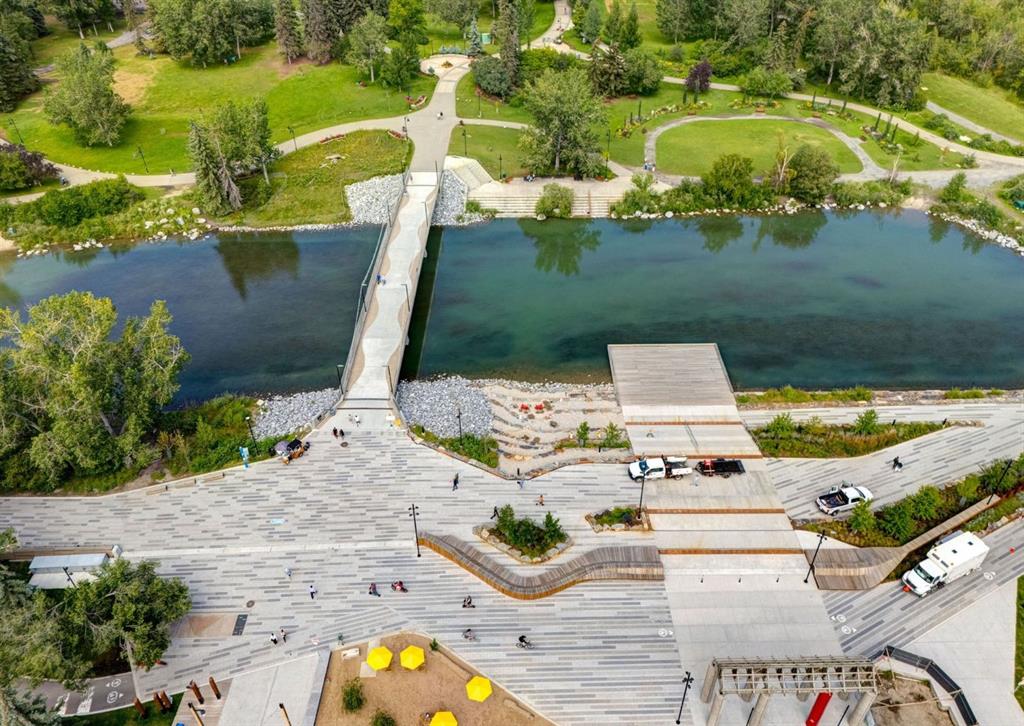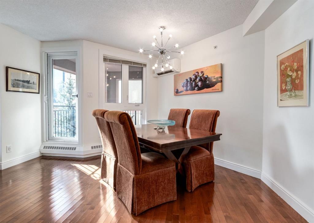 CORNER UNIT tucked among the treetops, this beautifully updated executive two-bedroom, two-bathroom condo offers a perfect blend of style and comfort. The thoughtfully designed open-concept layout creates an airy, spacious feel, highlighted by rich hardwood flooring and a stunning contemporary kitchen. Featuring granite countertops, stainless steel appliances, and an entire wall of pantry cabinetry, the kitchen is as functional as it is eye-catching. The living area is warm and inviting, complete with a gas fireplace and elegant mantle, charming bay windows, and direct access to the balcony with SE exposure. A well-proportioned dining space makes entertaining effortless. The primary suite includes a walk-in closet and a private three-piece ensuite. The second bedroom is incredibly versatile, ideal for guests or a home office, and comes equipped with custom built-ins, a cleverly concealed Murphy bed, a walk-through closet, private balcony, and its own four-piece ensuite. Additional highlights include in-suite laundry, a titled stall in the heated underground parking garage near the elevator, and an assigned storage locker. This solid concrete building is exceptionally well-equipped, offering an on-site property manager, car wash bay, 27 indoor visitor parking spaces, a gas BBQ hookup on the patio, a gated courtyard, and the added convenience of electricity included in the condo fees. Situated in a prime, walkable location, you’re just steps from downtown amenities, including the Peace Bridge, Prince’s Island Park, scenic Bow River pathways, Eau Claire Athletic Club, and a vibrant selection of restaurants and cafés. Enjoy easy access to the newly revitalized Eau Claire Plaza and the surrounding riverfront—perfect for walking, cycling, or simply taking in the outdoors. Pet friendly complex with board approval (2 pets up to 35 pounds each). Floor plans and a 3D tour are readily available, providing a glimpse into this stylish condo.