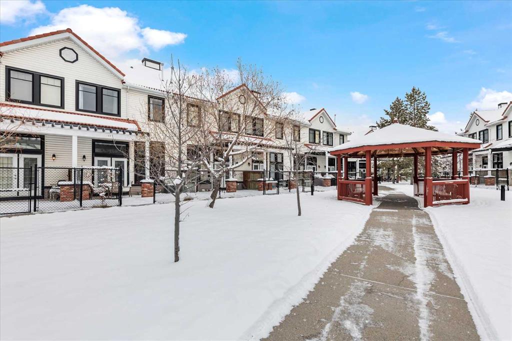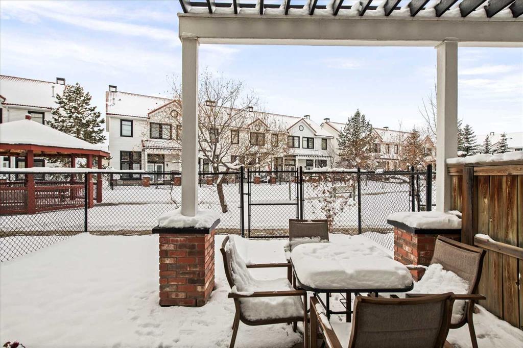 Cherished by its original owners since 2007, this lovely townhome is being offered to the market for the very first time. Set back from Royal Oak Way on an internal lane, this bright and welcoming residence reveals its character the moment you step inside. Heated tile flooring greets you in the foyer before you head up to the main level family room, where soaring vaulted ceilings and a dramatic wall of windows create an atmosphere of openness and light. Gleaming maple hardwood floors flow throughout the main living spaces, while garden doors open to your own fenced yard - a rarity in townhome living - complete with a pergola-covered patio for summer gatherings. Beyond your fence, a landscaped central courtyard unfolds with winding pathways, mature trees, and a charming gazebo shared by the community. Climb another half-flight to discover the kitchen and dining area, where warm maple cabinetry, and under cabinet lighting features, speak to the quality built into this home. A half-wall allows you to look down into the family room and out to the green-space beyond - maintaining connection across the levels. A second garden door leads to an upper balcony, while a convenient powder room on this level accommodates the stacking washer and dryer. The top floor presents dual primary bedrooms, each generously sized with its own walk-in closet and ensuite bathroom - ideal for a variety of living arrangements. Back at entry level, a door leads to the partial basement - currently unfinished but ideal for a home gym, hobby space, or additional storage. The attached single garage completes the practical amenities. Location amplifies the appeal: the community park with its recreation options sits immediately next door, two schools are within walking distance, and shopping and dining are a two-minute drive away. It's little wonder the original owners stayed so long!