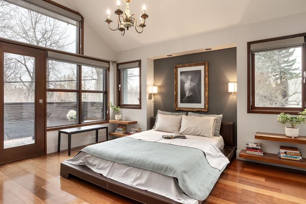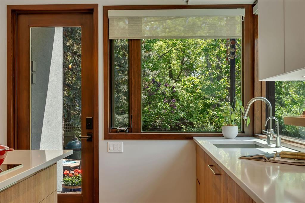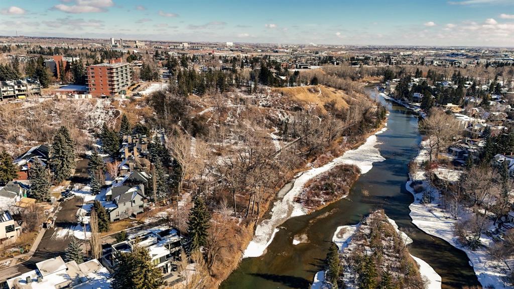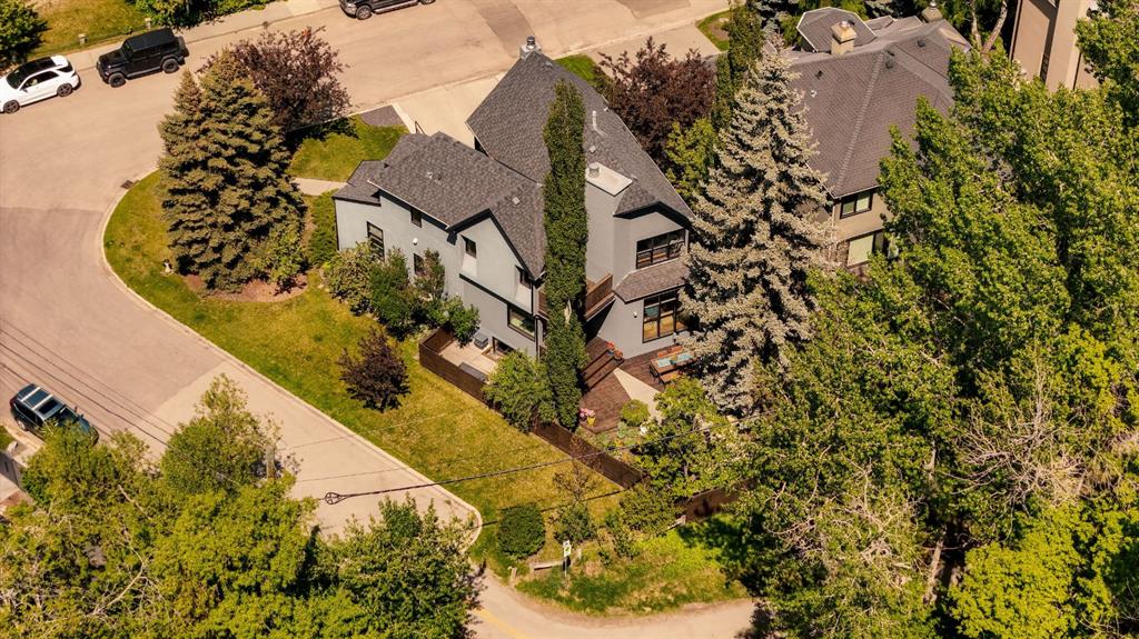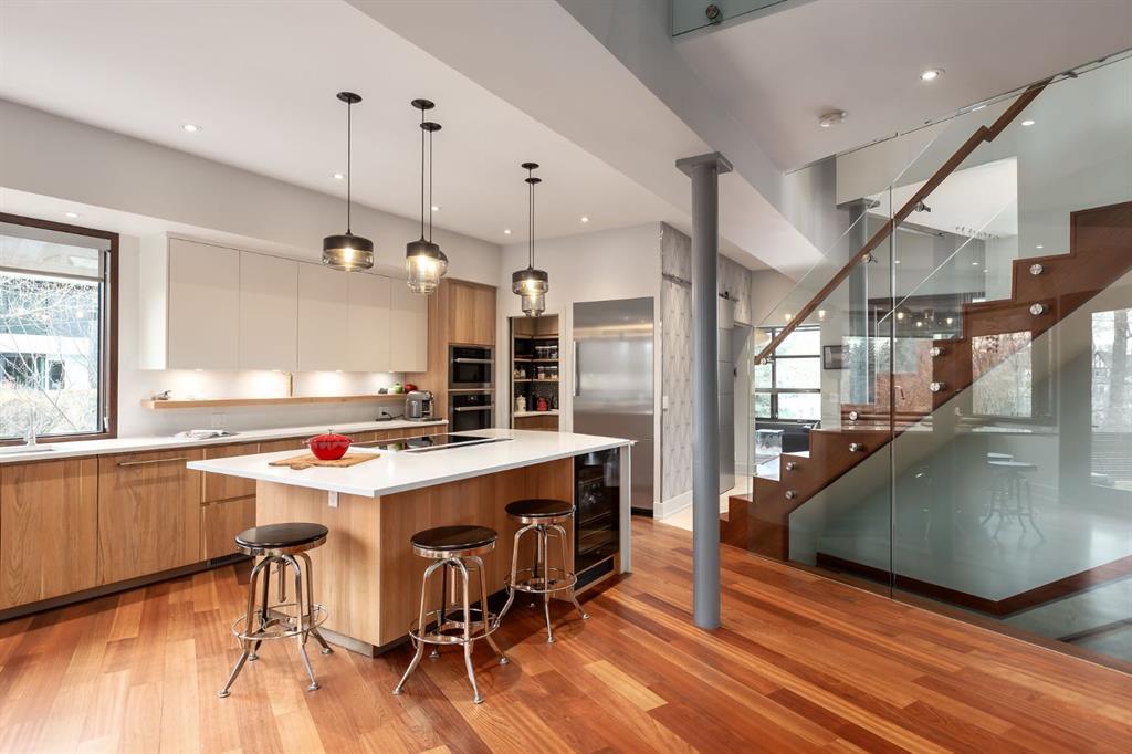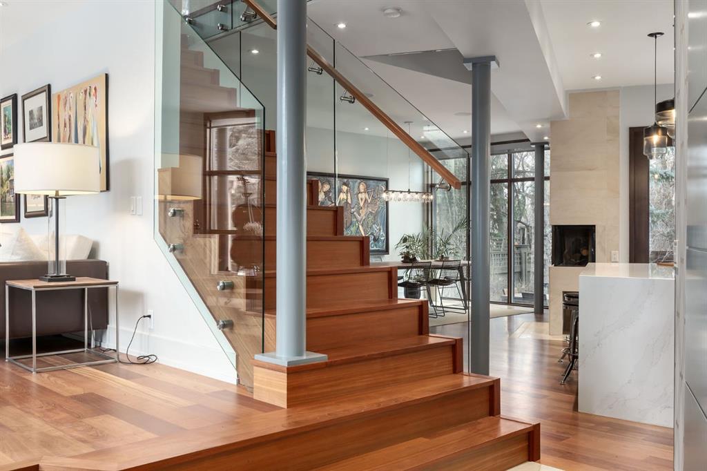 A rare offering nestled along Rideau Road - combining history, nature, and modern luxury— a prized river & park adjacent location. Opportunities like this in Rideau Park are few and far between, making this home a truly one-of-a-kind find. Inside, Brazilian cherry hardwood floors set the tone for timeless elegance. The main floor is designed for both connection and privacy, with a central glass staircase anchoring the layout. Enjoy the front library/den, an elegant living room, or dining with a view of the trees. The Porcelanosa kitchen is a showpiece—flooded with natural light and overlooking the park and river. Outfitted with a full Miele appliance package, induction cooktop with hidden hood, beverage center, walk-in pantry, and Porcelanosa finishes, it’s both functional and striking. A floor-to-ceiling window and wood-burning fireplace create a warm dining atmosphere. Upstairs, the southwest-facing primary retreat offers vaulted ceilings, a private balcony with river views, spa-like ensuite with natural stone, walnut cabinetry, heated floors, soaker tub, walk-in shower, and custom wardrobe system. Two additional bedrooms complete this level—one with cheater ensuite and steam shower, the other with rare river views. The finished basement includes a gym, rec room, 4th bedroom, full bath, laundry with sink, storage, and access to the front attached garage. The backyard flows seamlessly into one of Calgary’s most scenic parks, with the Elbow River Pathway just outside your door. Whether for morning jogs or evening strolls, this location is unmatched for lifestyle and connection to nature. Rooted in legacy, Rideau Park is one of Calgary’s most prestigious communities, once home to CHCT-TV’s first studios. Rarely do homes of this caliber on Rideau Road come to market—this is more than a home, it’s a once-in-a-generation opportunity to own a piece of Calgary’s history in an irreplaceable location.