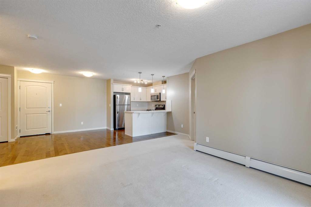 Thoughtfully designed for comfort, convenience and everyday ease, this updated main-level condo offers a highly functional layout with added mobility-friendly benefits. Just steps from the lobby and parking stall, access is simple and efficient, making daily routines easier for those seeking minimal stairs and smooth transitions. An open floor plan creates a natural flow between the kitchen, dining and living areas, supporting both relaxed living and effortless entertaining. Updated finishes enhance the kitchen, where stainless steel appliances, crisp white cabinetry and a peninsula island with breakfast bar provide a welcoming place to gather and connect. Clear sightlines extend into the adjacent living room, encouraging conversation and creating a warm, cohesive living space. Large patio sliders open directly to an exceptionally spacious 33 ft covered patio, offering a sheltered outdoor extension ideal for summer barbeques, morning coffee or quiet evenings surrounded by greenery. 2 well-proportioned bedrooms are thoughtfully separated for privacy, with the primary suite serving as a comfortable retreat complete with a large walk-in closet and a private 4-piece ensuite. A second bedroom and an additional 4-piece bathroom add flexibility for guests, home office use or shared living, while in-suite laundry enhances daily practicality. The building itself supports an easy, maintenance-free lifestyle, featuring a welcoming lobby with fireplace, seating area and library that creates a true sense of community. Off-street parking and a separate storage locker provide valuable convenience and security. Walkable access to nearby shopping, coffee spots, medical services and restaurants places everyday needs within easy reach, while an extensive pathway system encourages an active lifestyle with connections throughout the community and along the Bow River. Exclusive access to the Cranston Residents Association clubhouse adds meaningful lifestyle value, offering residents-only amenities including sports courts, a spray park, skating rink and year-round programming designed for all ages. A short drive or bike ride connects easily to South Health Campus, the world’s largest YMCA and the amenities of Seton, with Fish Creek Park close by for outdoor recreation. Quick access to Deerfoot and Stoney Trail supports seamless commuting in all directions, creating a location that balances convenience, recreation and long-term livability.