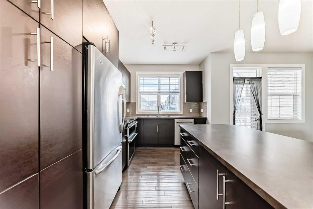 Welcome to this beautifully maintained two-storey townhome in the highly sought-after community of New Brighton. Offering over 1,500 sq ft of living space and an attached heated double garage, this home combines comfort, style, and functionality. Step inside through the spacious front entry and head up to the bright open-concept main living area, featuring hardwood flooring, and large windows that fill the space with natural light. The kitchen is a true highlight and a chef’s dream, complete with custom cabinetry, modern tile backsplash, a large island, and upgraded appliances including a Maytag refrigerator, double oven, and dishwasher. The adjacent dining area provides plenty of space for entertaining and offers access to a private balcony — perfect for summer BBQs. A conveniently located half bathroom completes the main level. Upstairs you’ll find three spacious bedrooms, all featuring large windows. The primary suite includes a walk-in closet and private ensuite, while the two additional bedrooms offer generous closet space and share a beautifully finished full bathroom with modern tile work. The upper floor also features a large laundry area with built-in cabinetry and storage, along with a Samsung washer and dryer. A tucked-away bonus storage room on the staircase landing offers the perfect place for seasonal items or a fun hideaway for kids. The lower level provides another versatile room, ideal for a home office, workout space, or flex room, along with access to the utility room and attached garage. Located in one of Calgary’s most family-friendly communities, New Brighton offers excellent schools, nearby shopping, and quick access to major roadways. Residents also enjoy access to the New Brighton Clubhouse, featuring a water park, hockey rink, tennis courts, and event facilities. Don’t miss your chance to own this exceptional home — book your private viewing today!