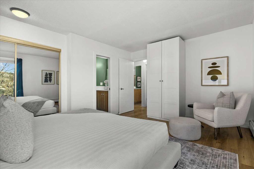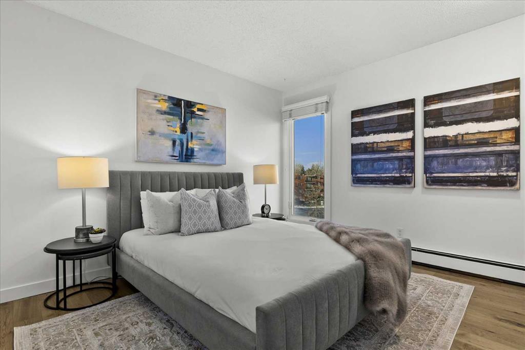 Are you looking for a bespoke condo in a premium location with a gorgeous view of downtown? What about nearly 1000sqf on the top floor with numerous renovations, a solarium and steps from the restaurants and shoppes of Kensington Village? Perched atop one of the most recognizable condo communities in Sunnyside, this corner unit home features in home storage, an updated kitchen with newer appliances (brand new dishwasher, washer and dryer) and quartz counters – all while being part of a micro community within one of Calgary’s top locations. The neighbours that call this development home are some of the best you will find and spend time outside in the summer sharing in laughs and memories. A well-managed complex of only 14 units - minutes to the Bow River and hop, skip and jump into downtown is exactly what you are looking for in 2026. In addition to being super transit accessible, the crown jewel of this home is the expansive living room highlighted by a gas fireplace, access to the SE facing patio with stunning downtown views, and a unique sunroom style windows that bathe the home in natural light. The primary suite easily fits a king size bed plus has room for a reading nook, additional closet storage and an ensuite bathroom. Another ample bedroom, 4-piece bathroom, in suite storage room, and an assigned parking stall complete this offering. Much of this home has been freshly painted and all was professionally cleaned right before listing, so it is READY for you and available for quick possession. The building also offers bike storage and a cedar sauna, undated roof and windows, and refreshed hallways. Come and have a look before She Gon’!