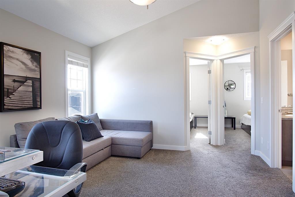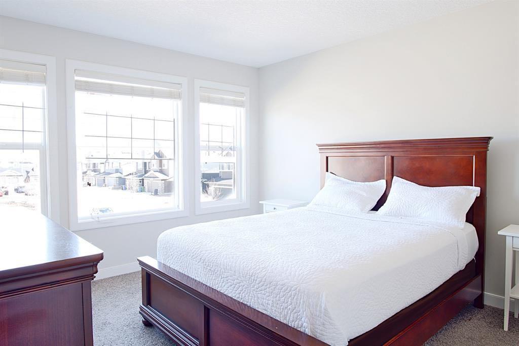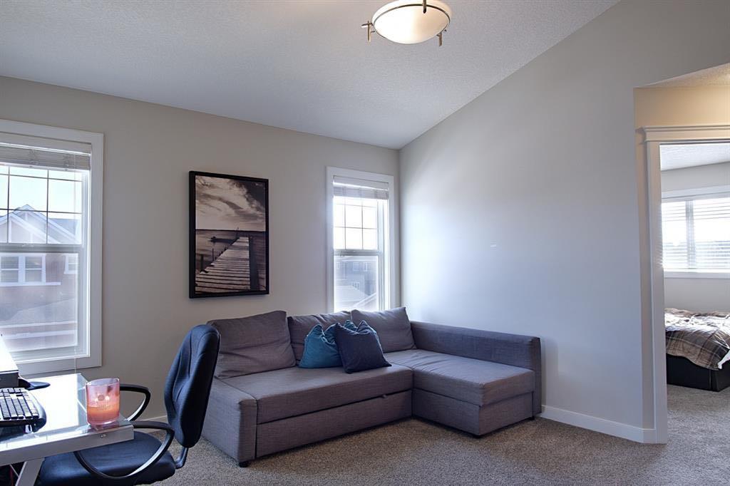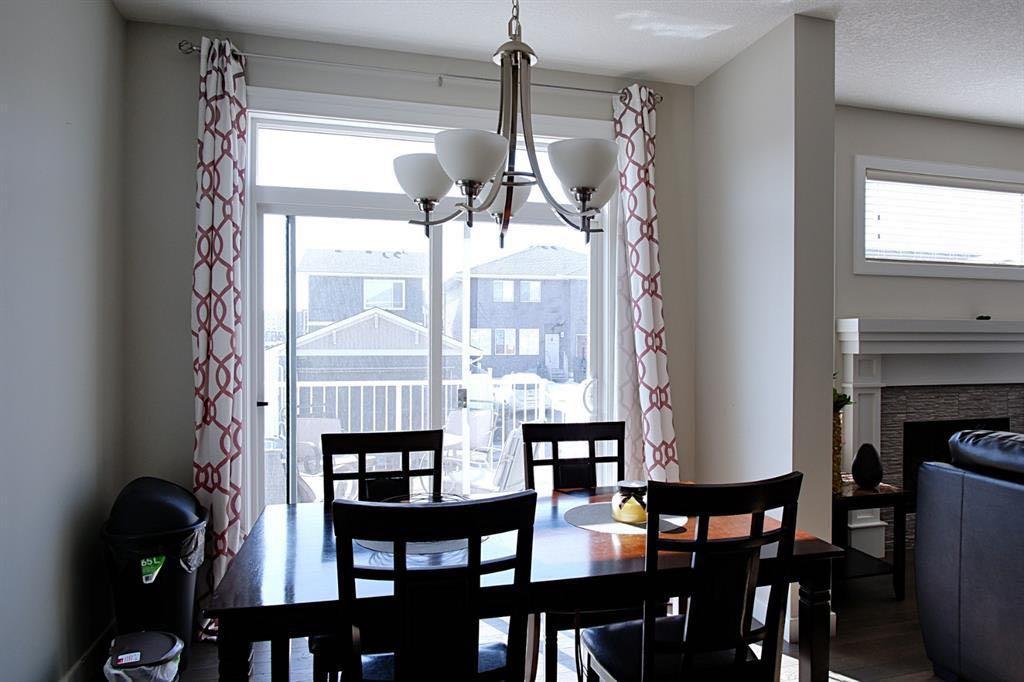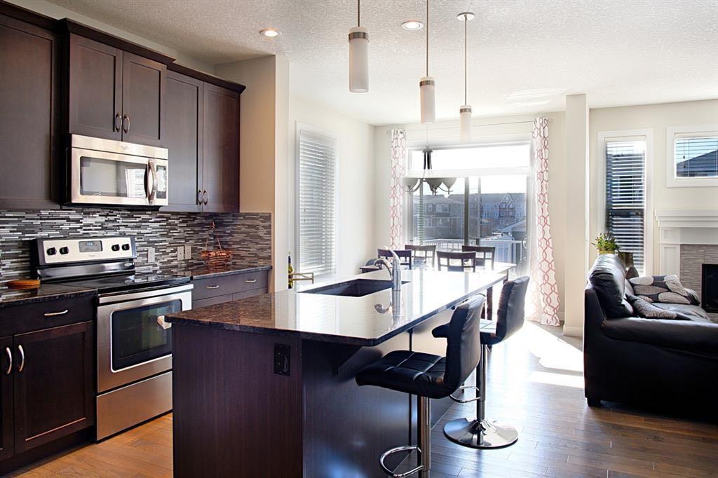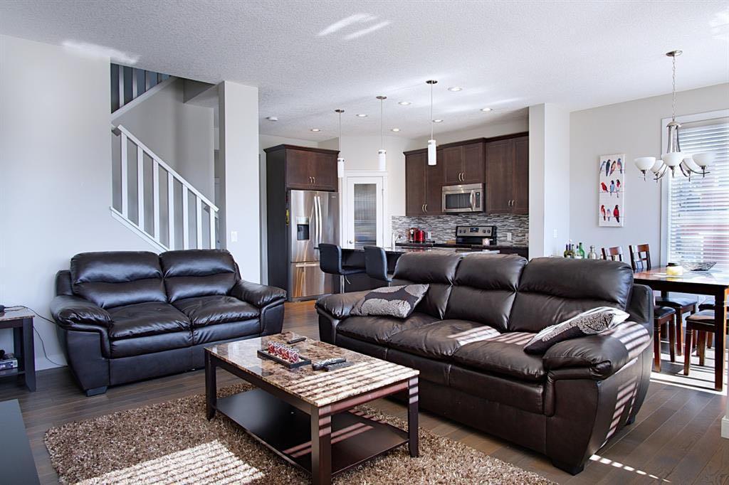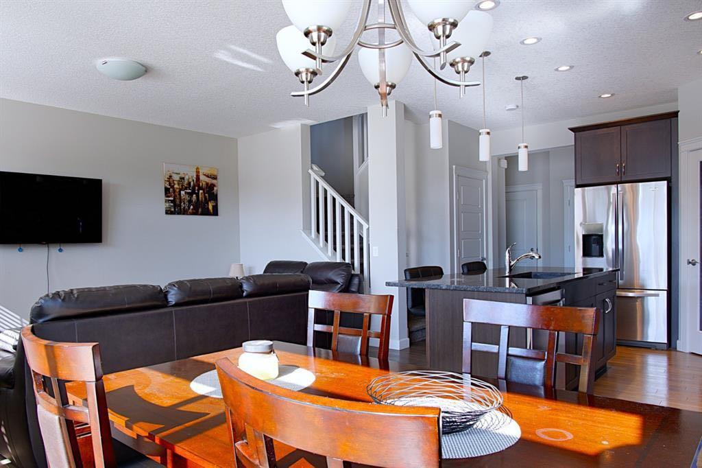 Welcome to this beautifully maintained front double attached garage semi-detached home in Redstone NE, offering space, functionality, and a family-friendly location just steps from parks and green space. Situated on a desirable corner lot, this property provides added privacy, abundant natural light, and enhanced curb appeal. Rich hardwood flooring flows throughout the main level, where the heart of the home is the spacious kitchen featuring granite countertops, a large breakfast bar island, stainless steel appliances, and a convenient walk-through pantry connecting directly to the mudroom and garage entrance. Central air conditioning ensures comfort during the summer months, and the home is also equipped with a water softener. Sliding patio doors lead to the deck for a seamless indoor-outdoor experience, while a cozy gas fireplace anchors the open-concept living and dining areas. Upstairs, you’ll find a vaulted central bonus room—perfect for movie nights, a play area, or a home office—along with the convenience of an upper-level laundry room, two generously sized front bedrooms, a full 4-piece bathroom, and linen storage. Privately positioned at the back, the spacious primary retreat features a large walk-in closet and a well-appointed 5-piece ensuite. The fully finished basement adds valuable living space and includes one bedroom, offering flexibility for a recreation area, guest room, home gym, or workspace. The double attached garage is upgraded with epoxy flooring, providing a clean, durable, and low-maintenance finish ideal for Calgary winters. Finished in neutral tones throughout, and with alley access plus parks and green space just steps away, this home perfectly blends comfort, convenience, and community living in one of NE Calgary’s growing neighbourhoods.