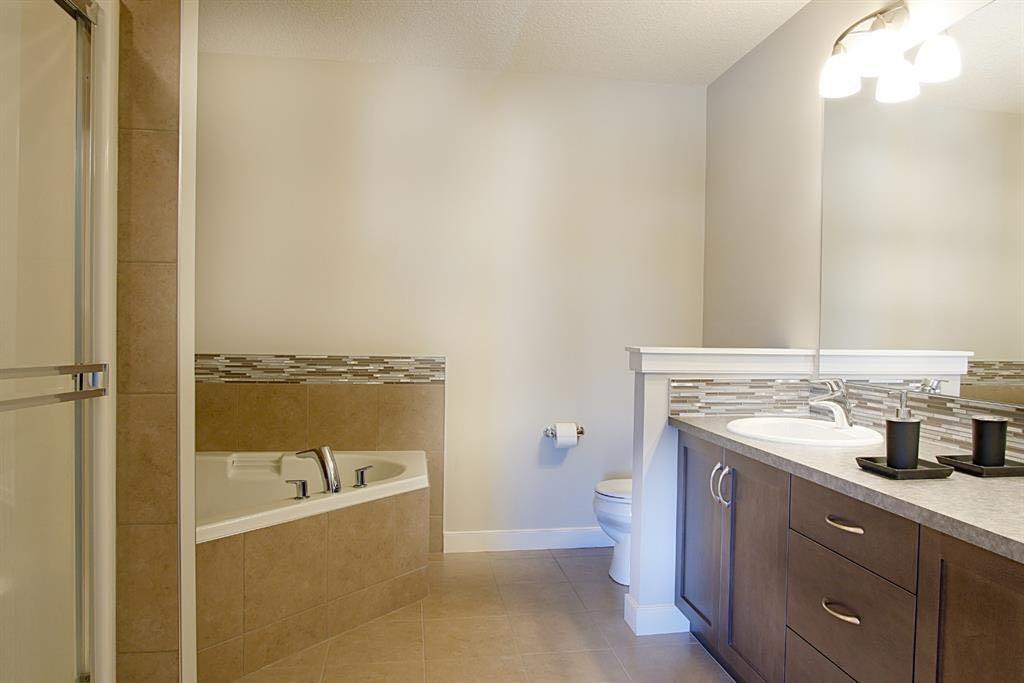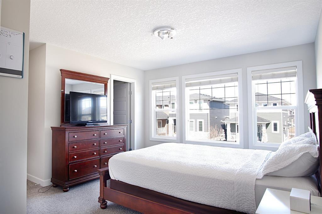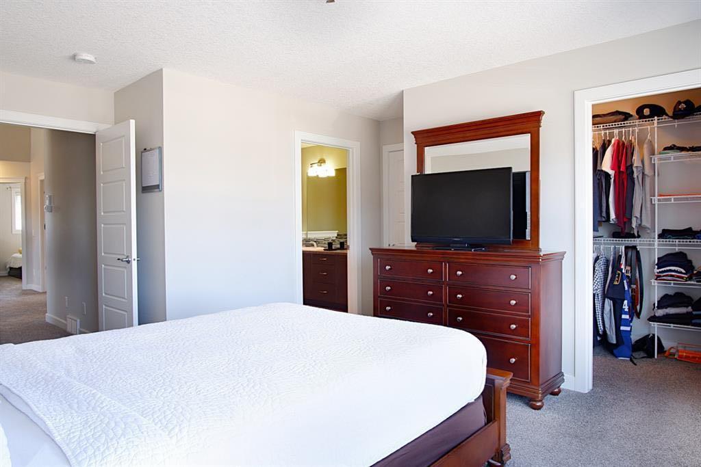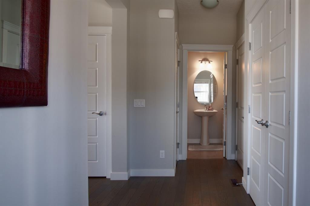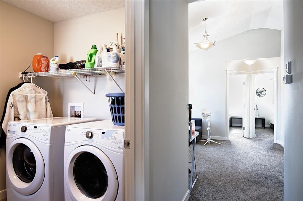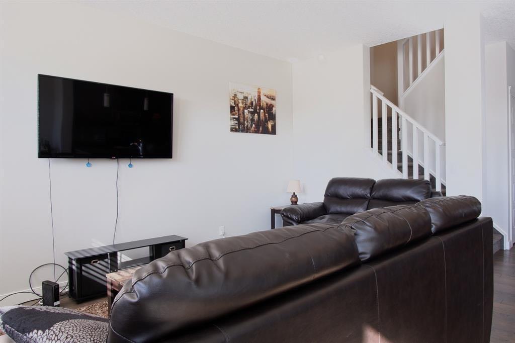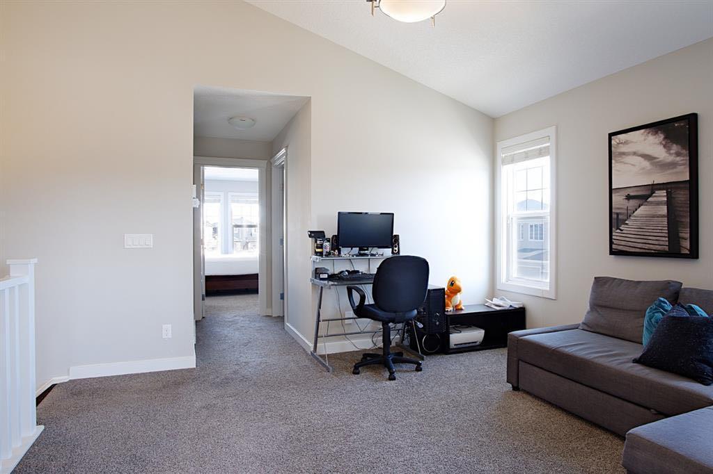 Welcome to this beautifully maintained front double attached garage semi-detached home in Redstone NE, offering space, functionality, and a family-friendly location just steps from parks and green space. Situated on a desirable corner lot, this property provides added privacy, abundant natural light, and enhanced curb appeal. Rich hardwood flooring flows throughout the main level, where the heart of the home is the spacious kitchen featuring granite countertops, a large breakfast bar island, stainless steel appliances, and a convenient walk-through pantry connecting directly to the mudroom and garage entrance. Central air conditioning ensures comfort during the summer months, and the home is also equipped with a water softener. Sliding patio doors lead to the deck for a seamless indoor-outdoor experience, while a cozy gas fireplace anchors the open-concept living and dining areas. Upstairs, you’ll find a vaulted central bonus room—perfect for movie nights, a play area, or a home office—along with the convenience of an upper-level laundry room, two generously sized front bedrooms, a full 4-piece bathroom, and linen storage. Privately positioned at the back, the spacious primary retreat features a large walk-in closet and a well-appointed 5-piece ensuite. The fully finished basement adds valuable living space and includes one bedroom, offering flexibility for a recreation area, guest room, home gym, or workspace. The double attached garage is upgraded with epoxy flooring, providing a clean, durable, and low-maintenance finish ideal for Calgary winters. Finished in neutral tones throughout, and with alley access plus parks and green space just steps away, this home perfectly blends comfort, convenience, and community living in one of NE Calgary’s growing neighbourhoods.