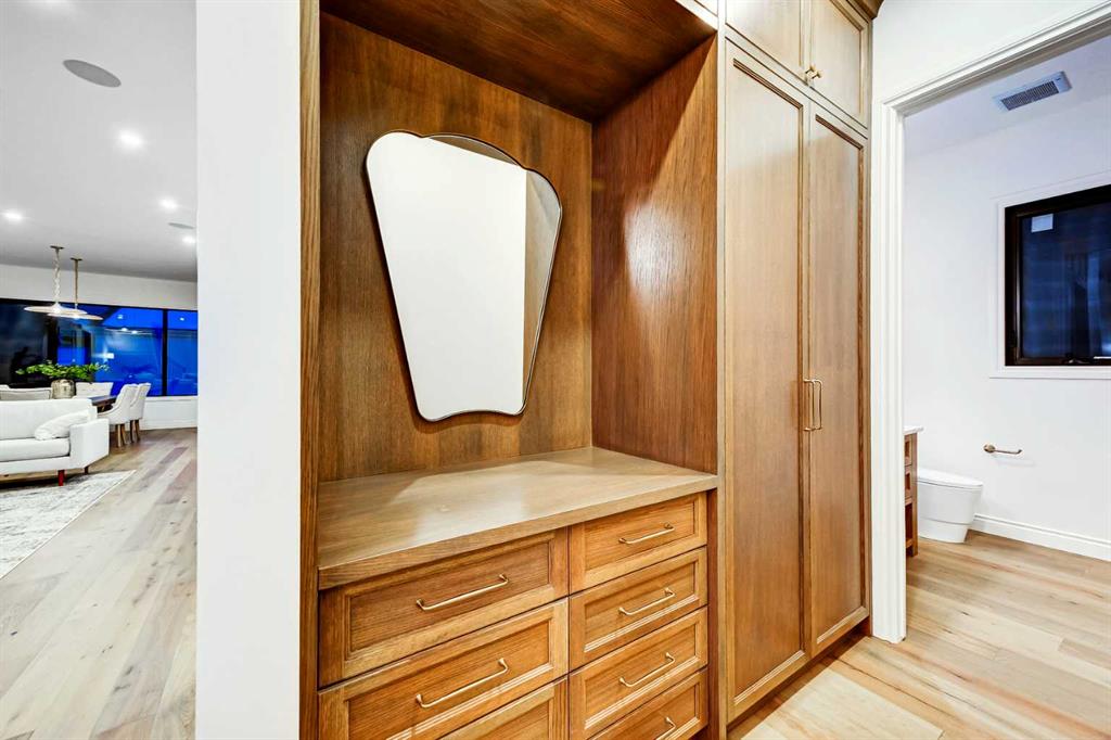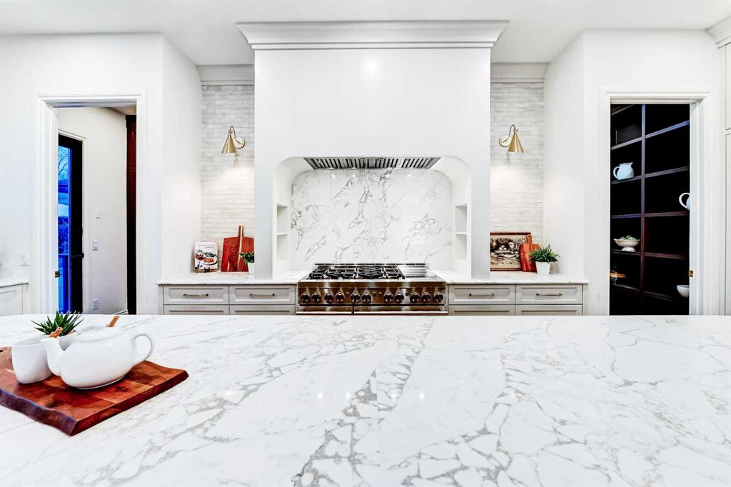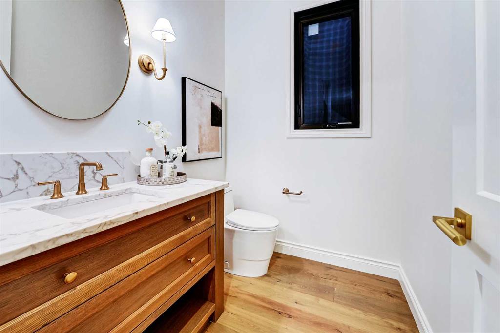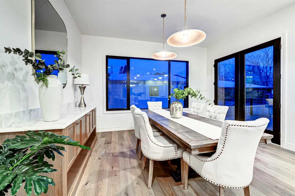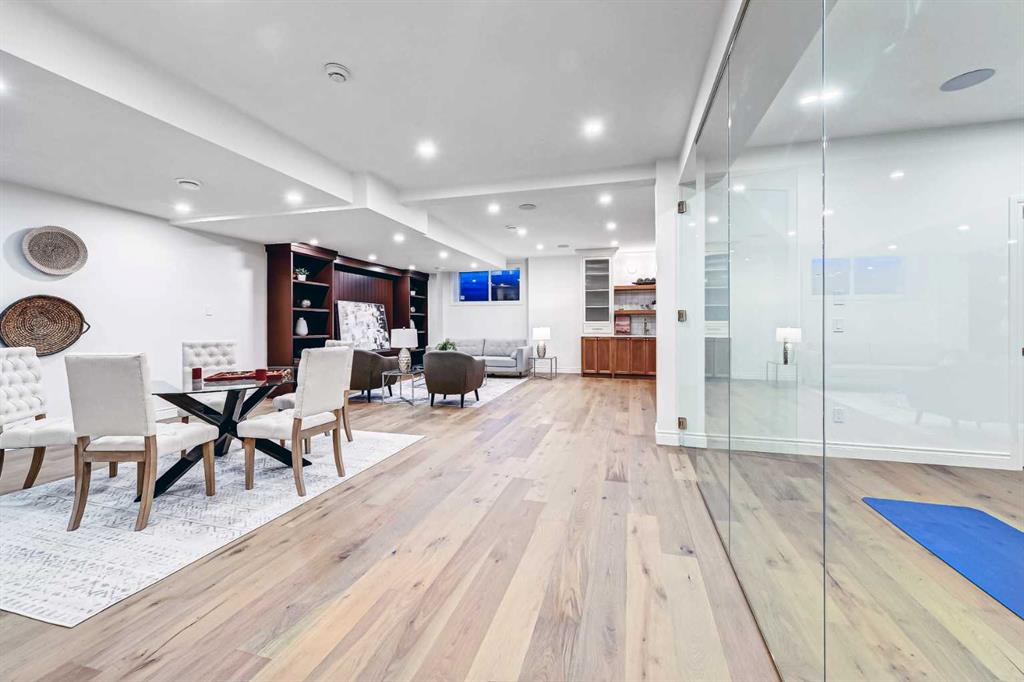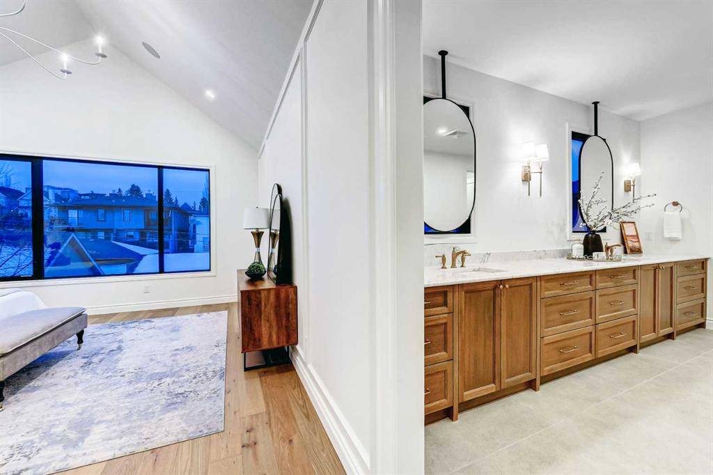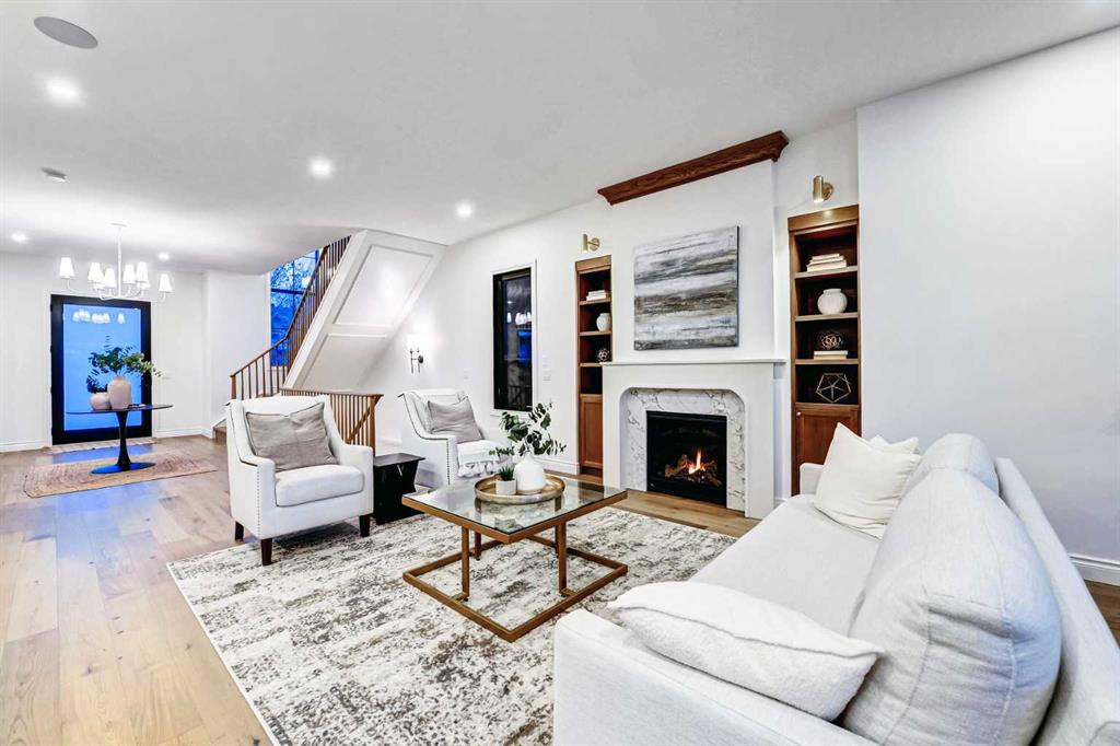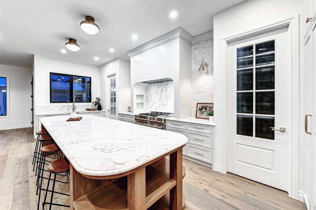 Set on a quiet street in the heart of Marda Loop, The Bardot is an exceptional custom residence that blends refined French-Country character with contemporary luxury. Thoughtfully designed and built by Cedar Rock Homes with interiors curated by Aly Velji Designs, this home offers four bedrooms, 4.5 bathrooms, and a rare triple-car garage. The striking exterior showcases a sophisticated mix of stone, stucco, and Hardie panel, accented by an aluminum cedar soffit entry, statement front door, and custom aluminum Lux windows with black interior cladding. The fully landscaped and fenced backyard is designed for low-maintenance enjoyment and features a generous composite patio with aluminum and glass railing, creating a private outdoor retreat. Inside, wide plank white oak engineered hardwood flooring flows throughout all levels, complemented by solid core doors and custom site-built cabinetry with wood dovetail drawers. Soaring 10-foot ceilings on the main floor and 9-foot ceilings on both the upper and lower levels enhance the home’s bright and open feel. The main living area is anchored by a cozy gas fireplace and transitions seamlessly into the chef-inspired kitchen featuring a premium JennAir appliance package, including a 48-inch gas range, 48-inch panelled refrigerator, panelled dishwasher, and a microwave drawer integrated into the island with additional storage on both sides. A curved quartz slab island, custom cabinetry, and a bespoke hood fan create a stunning focal point, while the adjacent butler’s pantry adds extended storage and elevated lighting. The dining space is highlighted by a custom oak sideboard, and a spacious mudroom with tailored millwork ensures everyday functionality. A private front office is thoughtfully designed with French doors, floor plugs, and custom glass-front cabinetry. Upstairs, three generously sized bedrooms each feature walk-in closets and private ensuites with heated tile flooring. The primary retreat is highlighted by vaulted ceilings and a spa-inspired ensuite complete with an oversized steam shower with dual rain heads, a freestanding tub, solid slab stone backsplash, and custom hanging mirrors. A beautifully finished upper-level laundry room with sink, hanging rod, and custom cabinetry completes the floor. The fully finished basement expands the living space with a gym, TV and games area, wet bar with beverage fridge, full bathroom, and ample storage. Mechanically, the home is equipped with dual-zone high-efficiency furnaces with humidifiers, along with rough-ins for in-floor basement heating, air conditioning, central vacuum, speakers, security system, and exterior cameras. Every detail of The Bardot reflects intentional design, superior craftsmanship, and timeless appeal, all just steps from Marda Loop’s vibrant shops, restaurants, parks, schools, and only minutes from downtown Calgary.