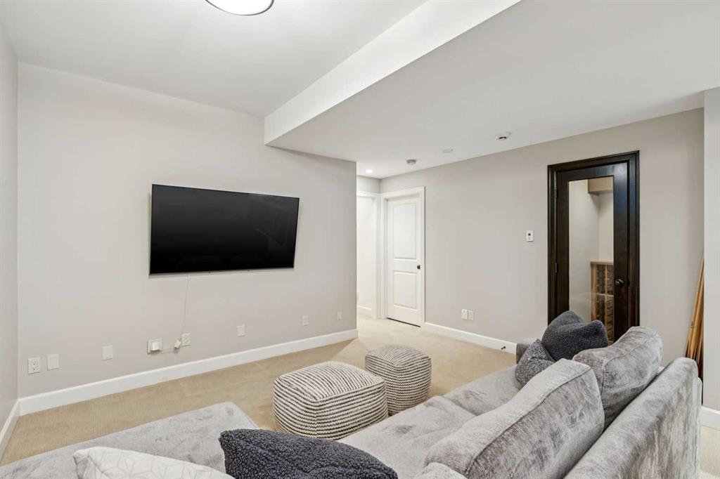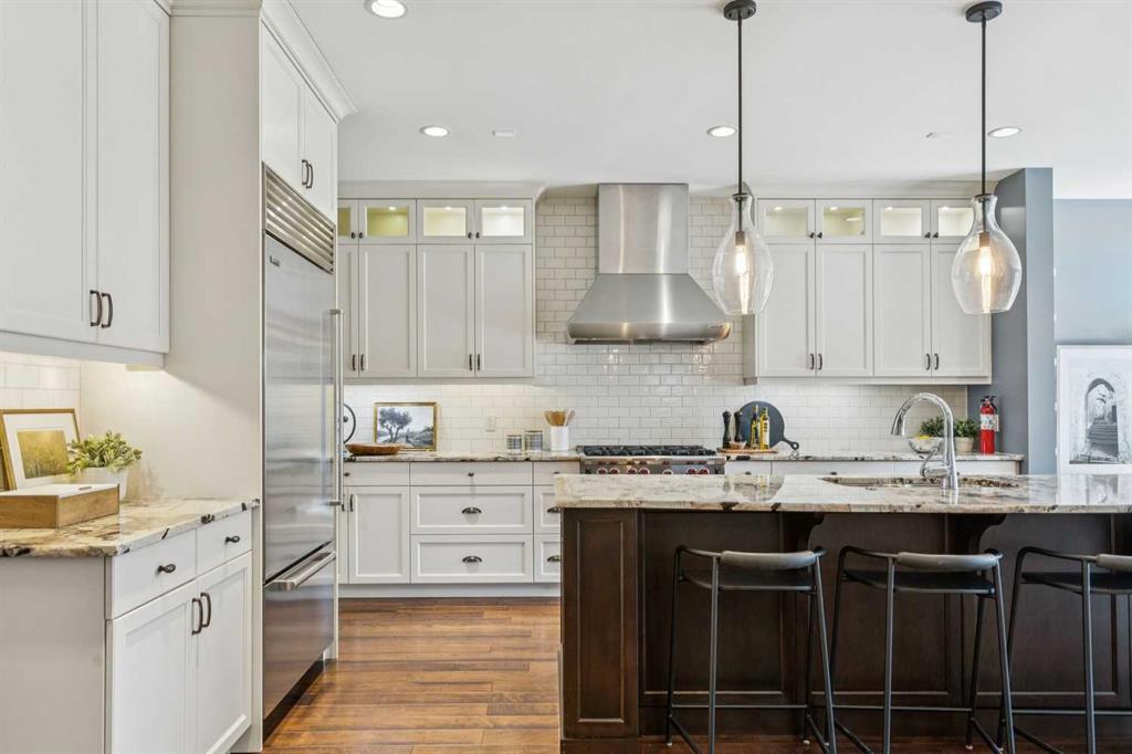 **Open House Saturday March 21 - 2:30 - 4pm** Situated on a popular street, this elegant residence offers a sunny south-facing backyard + impressive city views. Substantial in size with 3,400 sq ft above grade + a fully developed walk-up lower level, the home delivers generous scale + a thoughtfully designed layout throughout. Spacious principal rooms are complemented by rich wide planked hardwood flooring on the main level. The entrance opens into a pleasing living room/dining room entertaining space with large picture window + gas fireplace + transitions to a comfortable heart of the home kitchen/great room with a convenient office nook that is ideally positioned just off the kitchen. The chef’s kitchen is well-appointed with professional-grade appliances, including a Wolf gas stove + Sub-Zero refrigerator, along with custom cabinetry, granite countertops, abundant storage + prep space, a large island + informal dining area. The adjoining great room features a fireplace + easy access through patio doors to the pretty south facing backyard with concrete patio + lawn as well as a double detached garage. On the second level there are three substantial bedrooms, a very large office space which easily could be an additional bedroom + a dedicated laundry room. The primary bedroom is a refined retreat, complete with a double-sided fireplace, dressing room + a spa-inspired ensuite featuring a soaker tub, standalone rainfall shower + large dual vanities with ample storage. A generous third level lounge with both front + rear balconies showcases mountain + city views. The fully developed lower level includes an additional guest bedroom, a full bath, gym, expansive entertaining space, wet bar + temperature controlled wine room. Ideally located close to restaurants, shopping, parks, playgrounds + the library, this home combines comfort, function + lifestyle in a desirable inner-city setting.