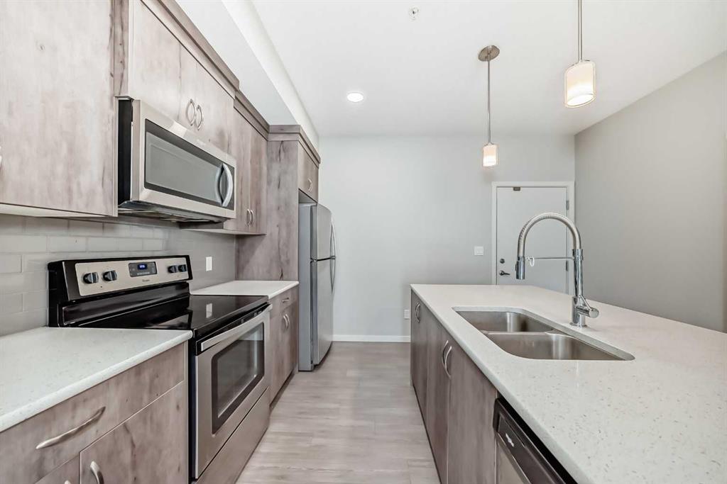This sleek 2 bedroom, 2 bath condo is waiting for you. This unit's open floor plan is spacious and bright with 9 ft ceilings throughout. The kitchen features a large quartz island with plenty of seating space and cupboards. There is a large laundry/storage room which is plenty big enough to store your bikes and possibly camping equipment for your great weekend get aways. There is a spacious deck for relaxing after a busy day or having friends by for a bbq. From the deck there is a great view of the South Campus Hospital which is only a few minute walk. Also is this great community is the new YMCA which is just across the street from this awesome property. Also featuring in the neighbourhood is a high school, library, movie theatres, plenty of restaurants, shopping, parks and playgrounds. This building is pet friendly with approval of course. There is titled underground parking plus underground and outside visitor parking. Don't delay call your favourite Realtor today for your private showing.