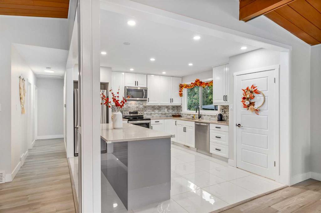 This Fully renovated Bungalow is located in desirable, secure and prestige South community of Willow Park and features 5 bedroom, 3 bathrooms, attached garage and private south faced Yard. Open plan main floor offers modern vinyl flooring throughout the living and main areas, vaulted wood ceiling adds warmth and character. The open kitchen is perfect for entertaining and family gatherings, while abundance of windows fills the space with natural light. The home features on the main floor, 3 bedrooms, one full ensuite bathroom and one full common bathroom and laundry. Fully finished basement with separate entrance is perfect for inlaws or nanny suite and offers huge recreation room, two bedrooms, own laundry and full bathroom. Single attached garage. New shingles 2025. Prime location with easy access to parks, shopping, schools, a golf course and transit. Just Move in and Enjoy the Summer.