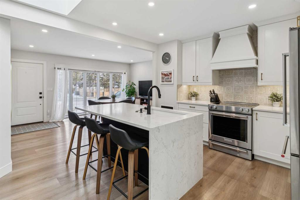 Perfectly situated at 412 Athlone Rd SE, this bungalow has been transformed through a comprehensive "to the studs" renovation where every detail was crafted from the ground up. From the moment you arrive, the striking Hardie board exterior and professional landscaping hint at the quality within. Inside, the layout is defined by a seamless flow and an abundance of natural light, anchored by luxury vinyl plank flooring with premium cork soundproofing that runs throughout the main level. The heart of the home is a chef-inspired kitchen that balances high-end function with show-stopping style. A massive quartz waterfall island serves as the social hub, complemented by an Italian ceramic backsplash, a custom range hood, and a suite of professional KitchenAid appliances. A bright skylight overhead ensures the space feels airy and open, while the adjacent sunroom—featuring a Pacific Energy wood-burning stove—offers a cozy sanctuary for any season. The primary suite is a true retreat, offering custom built-ins and a spa-inspired ensuite that rivals a luxury hotel. Indulge in the standalone deep soaker tub or the curbless glass-enclosed rain shower, all set against a backdrop of heated Italian ceramic floors and designer Delta fixtures. This level is thoughtfully designed for versatility, featuring an additional well-appointed bedroom and a refined 4-piece main bathroom, also elegantly finished with Italian ceramic tile and heated floors. The living space extends into the fully developed basement, where you will find two more generous bedrooms and a protected Dricore subfloor system for year-round warmth. This level also hosts a large, dedicated laundry room equipped with ample storage and high-efficiency Electrolux appliances. Beyond the aesthetic, the home’s infrastructure has been completely modernized with R60 roof insulation, central air conditioning, and an oversized heated garage with a silent-drive door. This isn't just another home; it is a complete reimagining of the classic Acadia lifestyle.