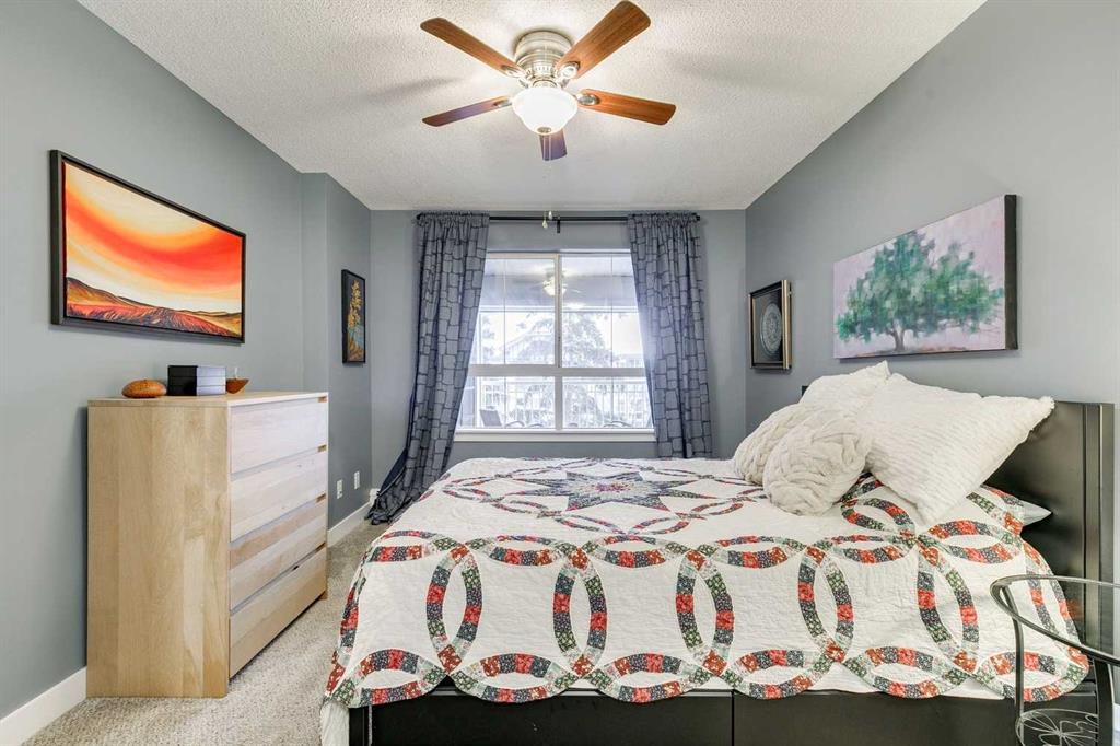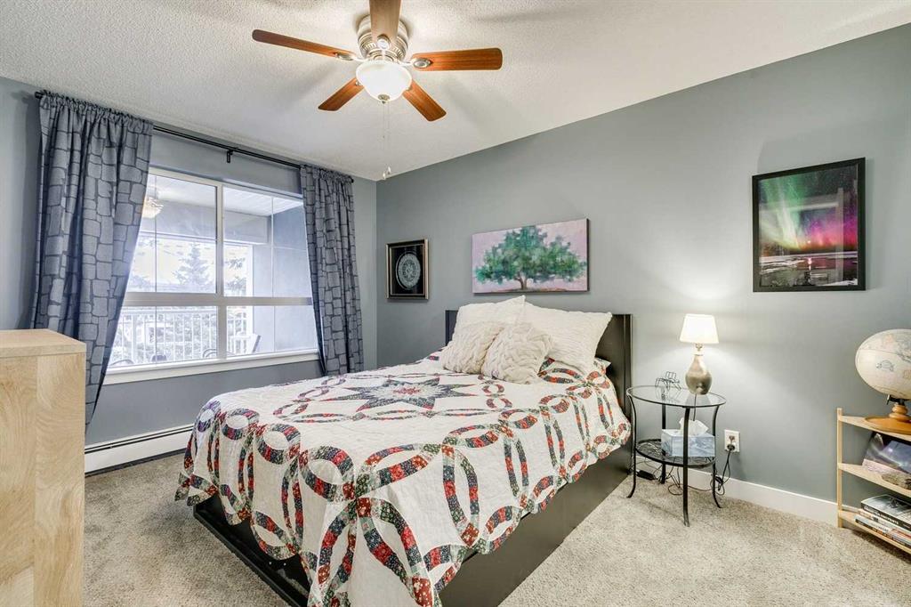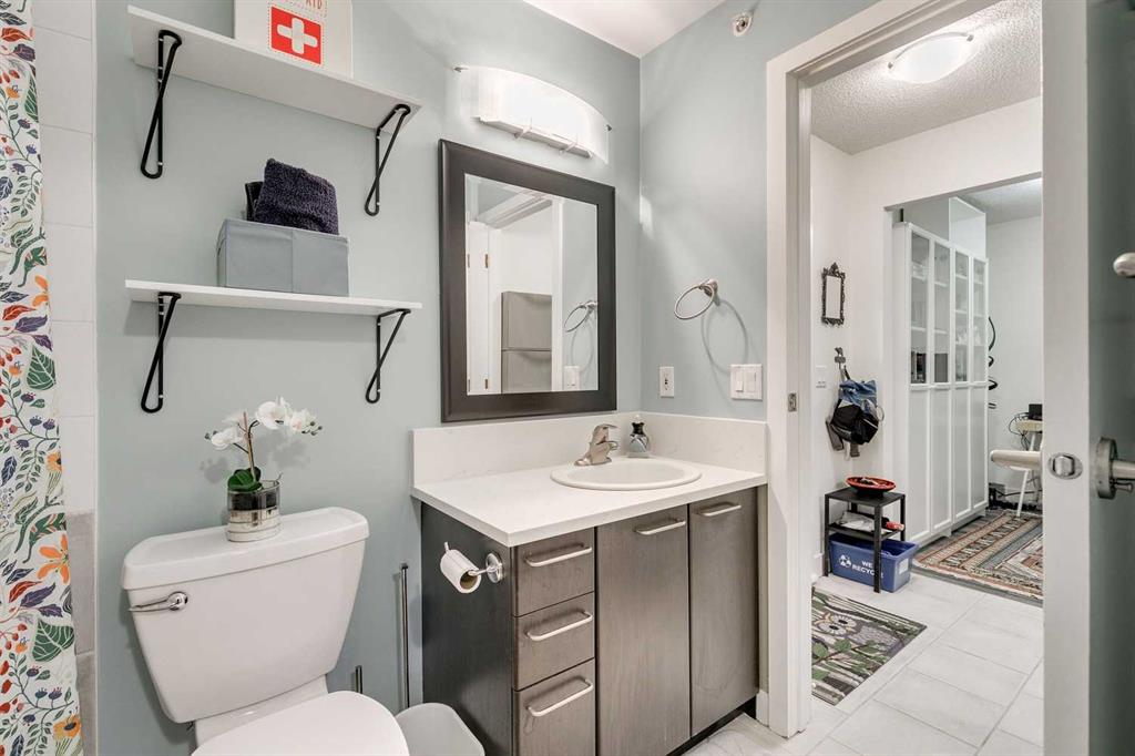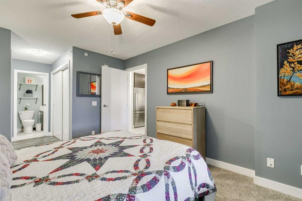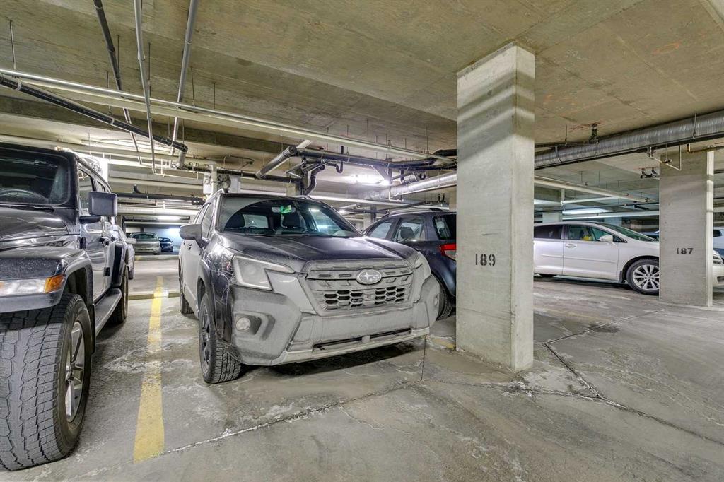 Tranquil top floor unit facing mature trees will help all your dreams come true in this 1-bedroom residence, ideally positioned in the heart of Lincoln Park, just steps from Mount Royal University & amenities. Whether you’re a discerning student, faculty member, or strategic investor, this sanctuary offers an unmatched lifestyle & opportunity. Thoughtfully updated, the home features a super functional kitchen with new fridge, stove, washer & dryer. Culinary enthusiasts will appreciate the gourmet kitchen, boasting cabinetry to the ceiling, and an impressive 8-foot quartz breakfast bar. Step outside onto the private 10' x 8' covered patio, an idyllic setting for your morning coffee or evening grilling with convenient gas BBQ hookup. Open-concept layout is both functional and inviting, enhanced by a dedicated den/office that truly has enough space to use for function. A charming corner gas fireplace anchors the living space, complemented by luxury vinyl plank flooring for a contemporary finish. The bedroom is a serene retreat, complete with plush carpeting, a ceiling fan, a generous double walk-in closet, and access to the beautifully updated 4-piece cheater ensuite with new tower shelf, curved shower rod, and a quartz vanity with elevated fixtures. Titled underground parking stall accompanies the unit—an invaluable feature in this sought-after building. You can also offer your guests underground visitor parking for their convenience. Residents of this impeccably maintained, pet-friendly building enjoy premium amenities, including a fully equipped fitness centre, a party room, and two guest suites for company so they can visit in comfort. Additional perks include secure storage locker, multiple bike storage rooms, and TELUS PureFibre connectivity for seamless, high-speed internet throughout. More than just a home, this exceptional property offers a refined, turnkey lifestyle in one of Calgary’s most desirable southwest communities.