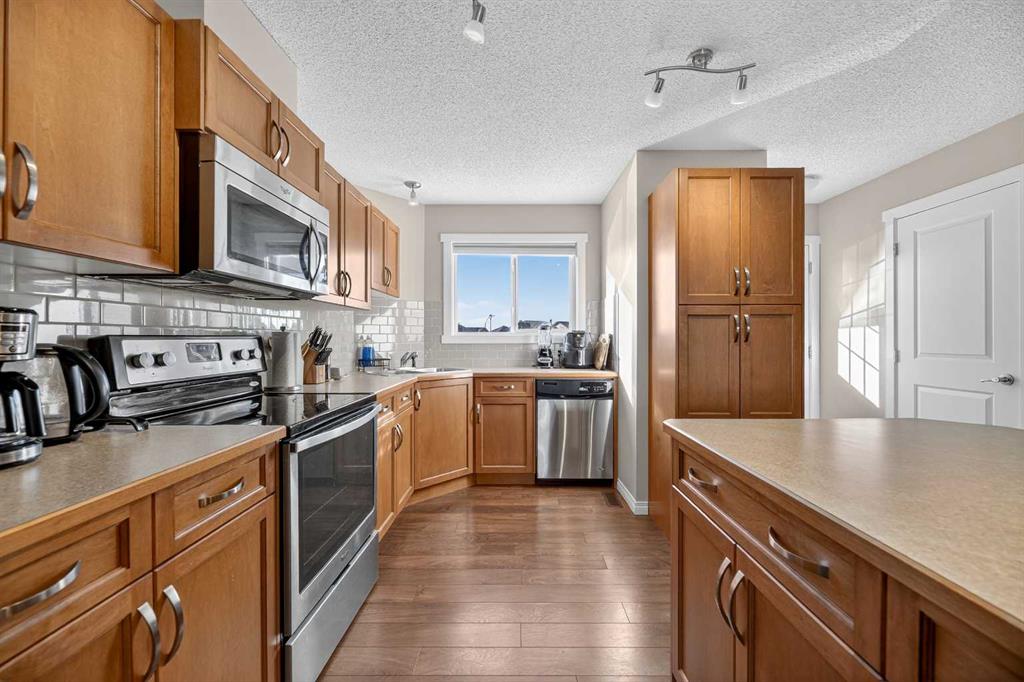 Come take a look at this well-maintained 2-storey townhouse condo in Clover — a quiet, growing community where comfort meets convenience. Offering 1,134 sq ft of living space, this home features 2 spacious bedrooms, each with its own private ensuite, and 2 assigned parking stalls just steps from your front door. The bright, open kitchen includes stainless steel appliances, ample cabinetry, and a large island with seating for four. The living room boasts a north-facing picture window and opens to a private patio backing onto green space. The unfinished basement with roughed-in plumbing offers endless potential for customization — add a bedroom, office, or rec room to suit your needs. The Clover Complex features a landscaped courtyard, visitor parking, and is pet-friendly (with board approval, including small dogs). Enjoy easy access to walking paths right outside the complex. Don’t miss your chance to own in one of Carstairs’ most welcoming communities — book your showing today!