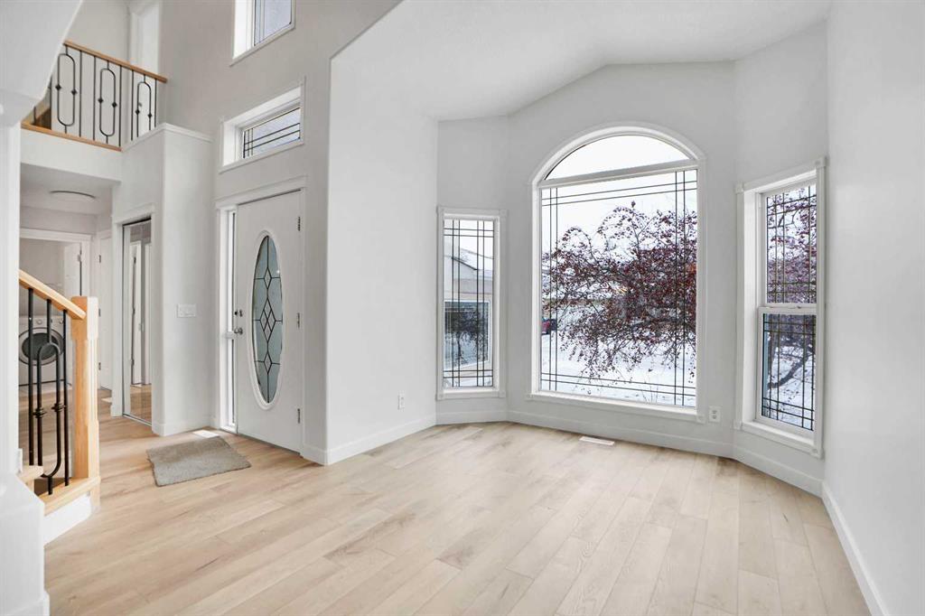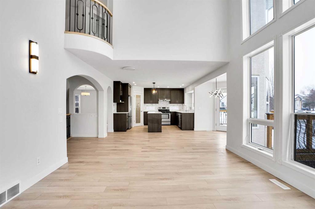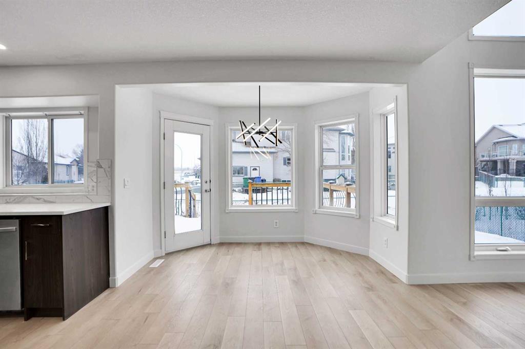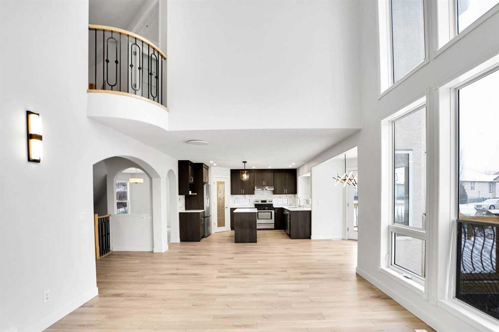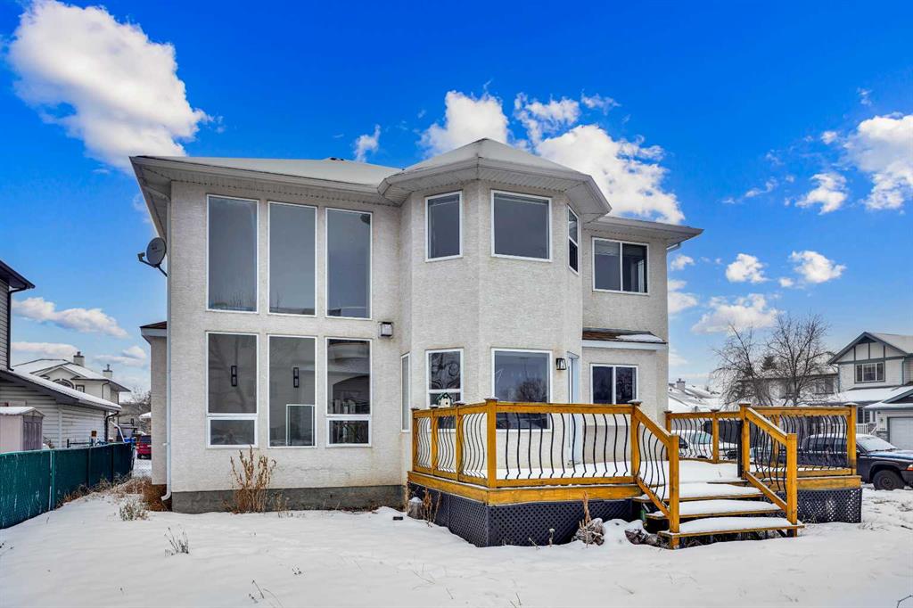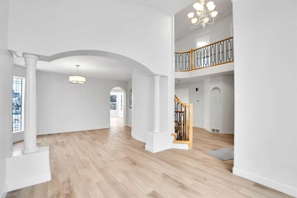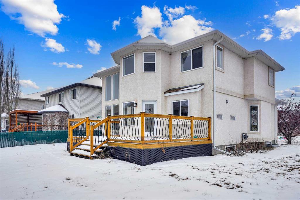 Life really is better by the lake — Welcome to The Cove in Chestermere! This beautifully renovated 2-storey home sits on a large corner lot backing onto pathways and green space, just a short walk to Chestermere Lake, The Cove Beach, parks, playgrounds, and off-leash areas. Set on a generous corner lot, this property gives your family the rare balance of privacy, convenience, and year-round recreation. Walk the kids to the beach, hit the pickleball courts, let the dog run at the off-leash park, or enjoy sunset strolls along the water… all just minutes from your front door. Inside, the house greets you with that WOW moment — soaring 17’ ceilings, the sweeping curved staircase, and oversized windows pouring natural light across brand-new flooring. It’s a true “wow” entrance that sets the tone for the rest of the home. The main floor features a spacious formal living/dining area, a bright kitchen with centre island and pantry, a cozy family room with 3-sided fireplace, and a private main-floor office with French doors. Ceiling to floor Windows in the Family Room provide ample light during the day and gives you an unobstructed view of the backyard. Step outside onto your own private deck for summer BBQs or just relaxation after a long work-week. This house has it all. Upstairs offers 3 bedrooms including a generous primary suite with 5-pc ensuite and walk-in closet. The open-to-below hallway adds light and airiness throughout. The second and third bedrooms are towards the front of the house, with spacious closets, new carpets and light fixtures. The 4 pc bathroom down the hallway is also a master piece and Brand NEW with it's cabinetry, lighting, faucets, counter tops and shower area. The unspoiled basement is ready for your future development with 3 windows and lots of potential. Enjoy a large backyard with deck, concrete patio, and plenty of room for kids, pets, and entertaining. This is an ideal family home in a sought-after lakeside community—minutes to schools, shopping, transit and other commercial amenities. Move-In ready and Quick possession available! Come book your showing today and fall in love with it.