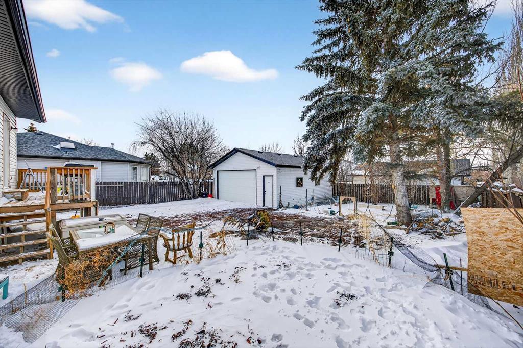 What a great opportunity in the charming & peaceful community of Irricana! This lovely Bi-level is nicely situated along a quiet street on a large oversized lot with a west facing backyard. The convenient side drive-thru access provides abundant parking, boat & RV storage AND the large 24' x 24' detached garage with 9' ceilings, 8' door and 220 V power bring tremendous value to this home. Inside has undergone upgrades over the years adding a modern calming ambiance. The kitchen was renovated in 2014 with all new cabinetry, countertops, loaded with storage, very stylish and functional with newer appliances. All the windows on the main floor and some in the basement were replaced in 2014, and in 2021 the 3 exterior doors were replaced. 2014 also brought new shingles, and new siding completing most of the exterior. New Hot water tank in 2024. Downstairs hosts new vinyl plank flooring, the basement has a large family room, 3pc bathroom, large bedroom, and den. The laundry / mechanical room has a walk out door with separate entry and is roughed – in to potentially be suited pending proper municipal permitting. The is a very large & private yard with spacious garden, self-cleaning duck tub with filtration system that drains into the ground and comes with filter, UV lights, aeration stones, and pumps. The rear deck was rebuilt in 2019 along with the front porch Embrace small-town charm while enjoying incredible accessibility – a short 30 min drive to Calgary, 25 to Airdrie offering every amenity imaginable, including Costco & Cross Iron Mills. This bungalow isn't just a home; it's your peaceful retreat with urban convenience offering the perfect blend of space, functionality, and potential— ready for its next owners to make it their own.
