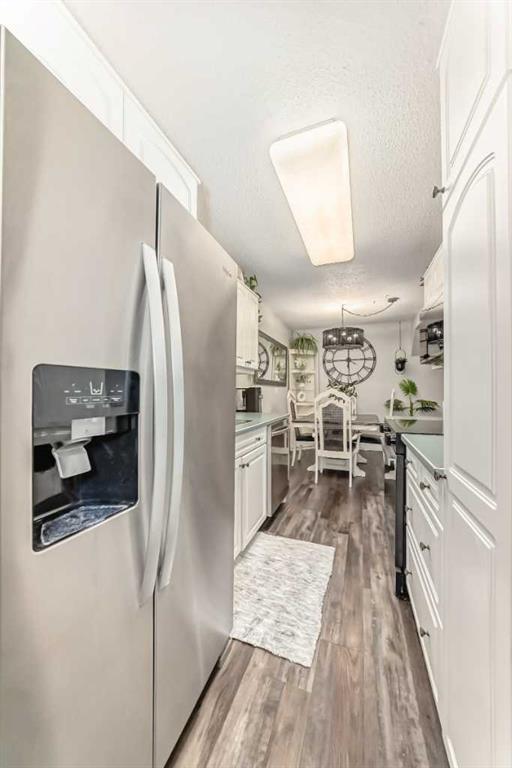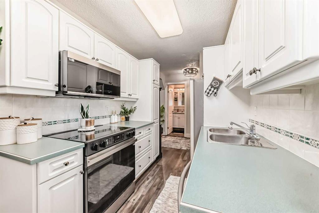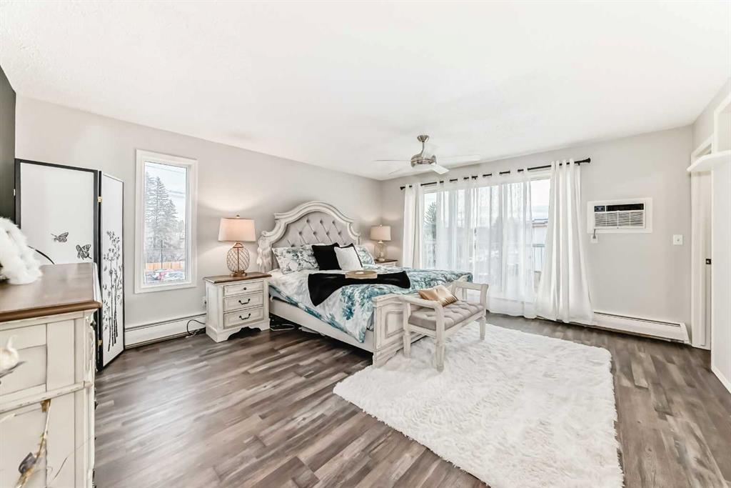 Spacious and bright end-unit condo offering two balconies, two bedrooms, two bathrooms, two wall A/C units, and two secured underground parking stalls. Larger than most suites in the building, this corner unit is flooded with natural light thanks to its desirable south- and east-facing exposure. The over-sized primary bedroom is a true retreat, featuring triple patio doors to a private sundeck, a generous walk-in closet, and a 4-piece ensuite with jetted tub and separate shower. The second bedroom is bright, inviting, and tastefully updated. The functional kitchen offers ample white cabinetry and extra storage, while the spacious living room, anchored by a cozy gas fireplace, creates a warm and welcoming atmosphere. Recent upgrades include fresh paint, vinyl plank flooring, updated baseboards, modern lighting, and newer appliances. Additional highlights include in-suite laundry, storage, elevator access, and a quiet, well-maintained 30+ adult building (no children permitted). Ideally located within walking distance to restaurants, coffee shops, amenities, and Red Deer’s extensive trail system, this condo offers low-maintenance living in an excellent central location.