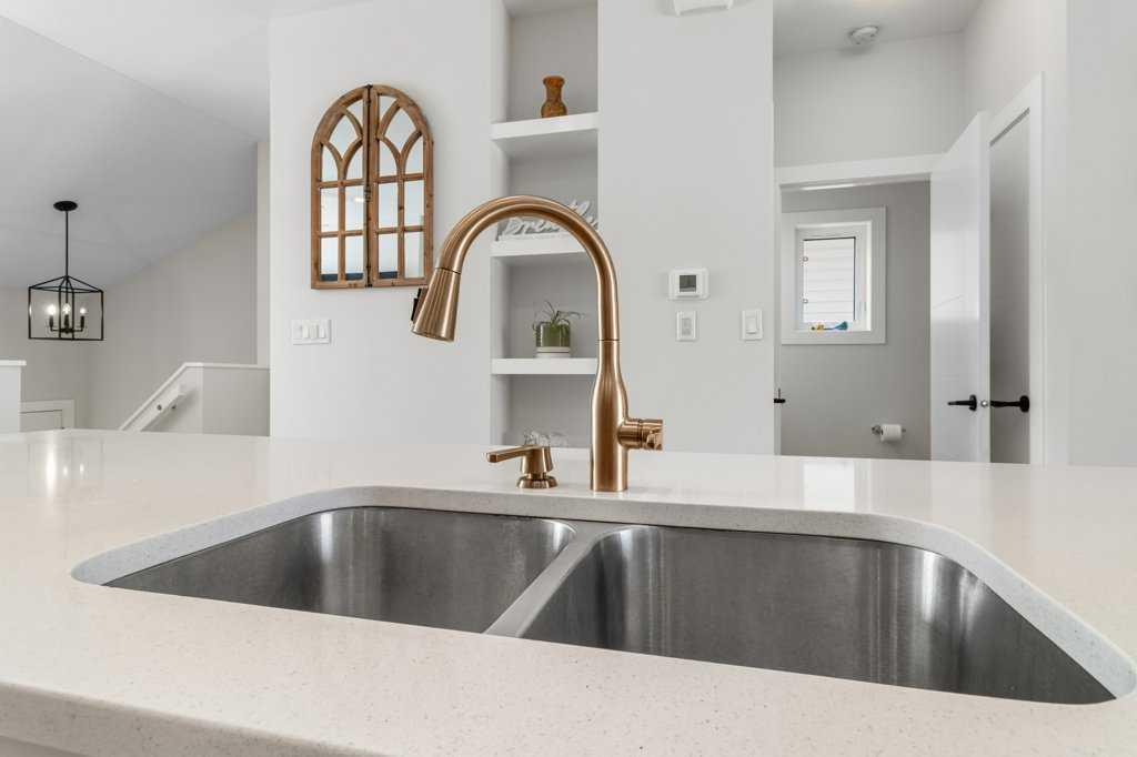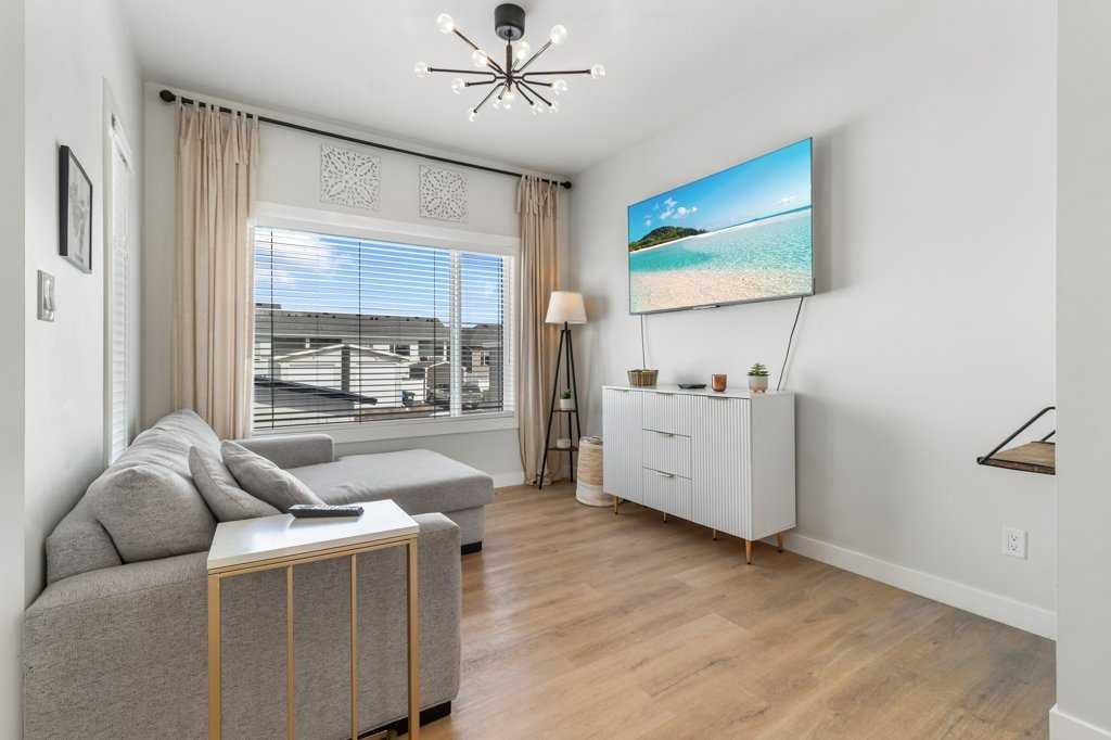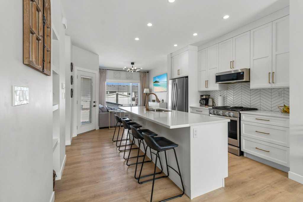Welcome to 52 Evergreen Way in Red Deer, located in the desirable and well established community of Evergreen. This beautiful end unit townhome offers a wider footprint and larger yard than some interior units, along with thoughtful upgrades and exceptional care throughout. Step inside to a spacious entry and head up to the bright, open concept main level featuring 9’ ceilings and luxury vinyl plank flooring. The stunning kitchen is beautifully finished with quartz countertops, full tile backsplash, a large island with seating, and an abundance of white cabinetry extending to the ceiling. It is open to the dining and living areas, creating the perfect space for entertaining or spending time with family. The living room showcases an oversized Napoleon gas fireplace with a custom feature wall, creating a warm and inviting focal point. The space is also thoughtfully designed with a built-in TV niche to conceal wiring for a clean, modern look, and the TV wall mount is included. From the main living area, step out to your private west facing deck where you can enjoy afternoon sun, evening sunsets, and open views of the green space. A phantom screen door was added to the deck in June 2025 and comes with warranty. The outdoor area has been carefully designed for low-maintenance living, featuring a stamped concrete patio, gravel landscaping, established perennials, and a well-built shed. The fully finished lower level offers three bedrooms, including a spacious primary suite with a walk-in closet and an updated ensuite featuring a large shower. Two additional bedrooms, a full bathroom, storage, and convenient in-hall laundry complete the lower level. Additional highlights include air conditioning, a high-end ceiling fan, stainless steel appliances including a gas stove, and both front and rear parking options. The yard is fully finished with no lawn to maintain, making this an ideal property for those seeking low-maintenance living. Located close to walking paths, scenic ponds, playgrounds, and within walking distance to Clearview Market, this home offers both comfort and convenience in a fantastic neighborhood.
