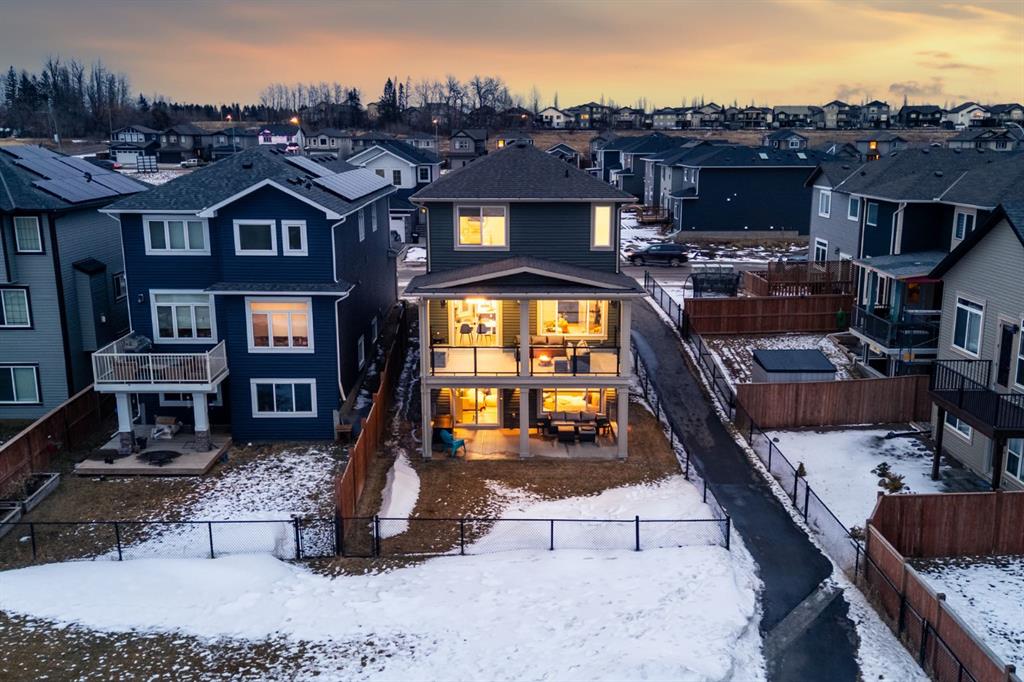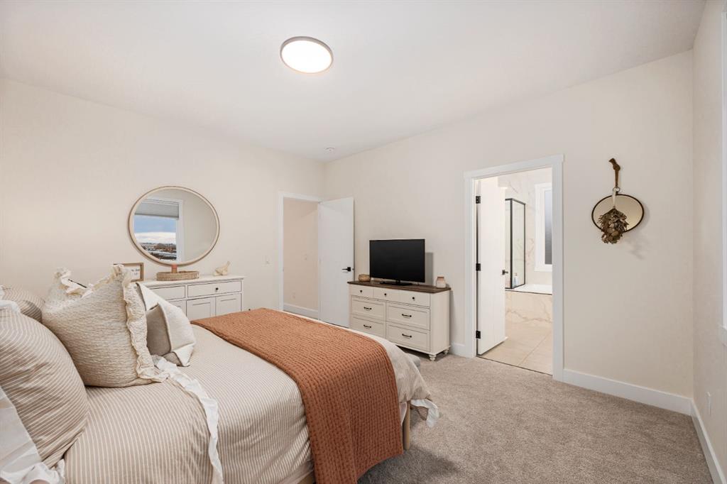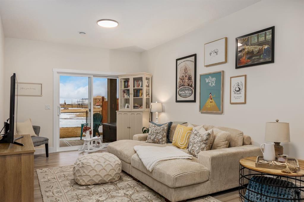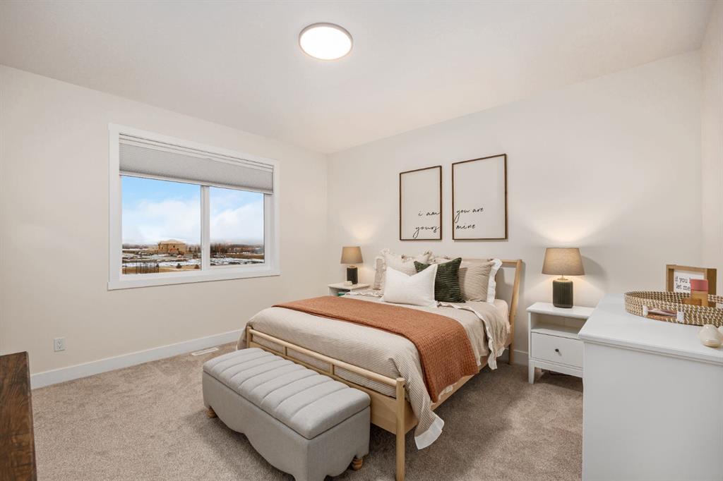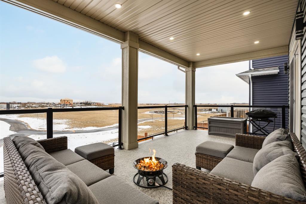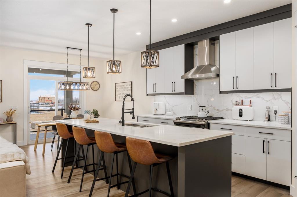 Discover refined living in this impeccably crafted 2024 custom-built two-storey walkout by Shayman Homes, located in the sought-after lake community of Lakewood in Strathmore. Backing onto a lush green space and walking path with no neighbours behind, this east-facing home offers nearly 3,000 sq.ft. of beautifully designed living space with luxury finishes throughout. The striking exterior with stone accents and extended driveway welcomes you into a bright foyer filled with natural light from oversized windows. The main floor features 9’ ceilings and luxury laminate flooring, flowing through a thoughtfully designed layout. A private main-floor office with an 8’ doorway provides the perfect workspace or flex room. The chef’s kitchen is the heart of the home, showcasing an expansive quartz island, soft-close white cabinetry with black hardware, undermount sink, and premium stainless steel appliance package including a gas range, chimney-style hood fan, built-in oversized microwave, dishwasher, and refrigerator with water hookup. A spacious pantry with built-in shelving and automatic lighting adds everyday convenience. The dining and living areas are flooded with natural light and anchored by a stunning floor-to-ceiling stone gas fireplace with custom mantel. Step outside to the covered upper deck spanning the width of the home, complete with recessed lighting, custom glass railings, and a gas line rough-in—ideal for entertaining while overlooking the landscaped yard and park. Upstairs features a vaulted ceiling opening into a massive bonus room, upper laundry with tile flooring and quartz counters, and three generously sized bedrooms. The primary retreat offers a spa-inspired ensuite with dual quartz vanity, 5’ soaker tub, floor-to-ceiling tiled shower, a private toilet room, and a walk-in closet with custom built-ins. A stylish 4-piece bathroom completes the level. The fully developed walkout basement extends the living space with 9’ ceilings, luxury laminate flooring, a spacious family room, and a custom 10’ wet bar with quartz counters, tile backsplash, and built-in cabinetry. Two large bedrooms, a 4-piece bathroom, mechanical room, and under-stair storage complete the lower level. Outside, enjoy a covered concrete patio, fully landscaped yard, and unobstructed views of the greenspace and playground. Located minutes from schools, amenities, recreation, and golf, with Calgary just 30 minutes away, Lakewood offers a lifestyle unlike any other. Dont miss your opportunity to own this stunning family home. Book your private showing today.