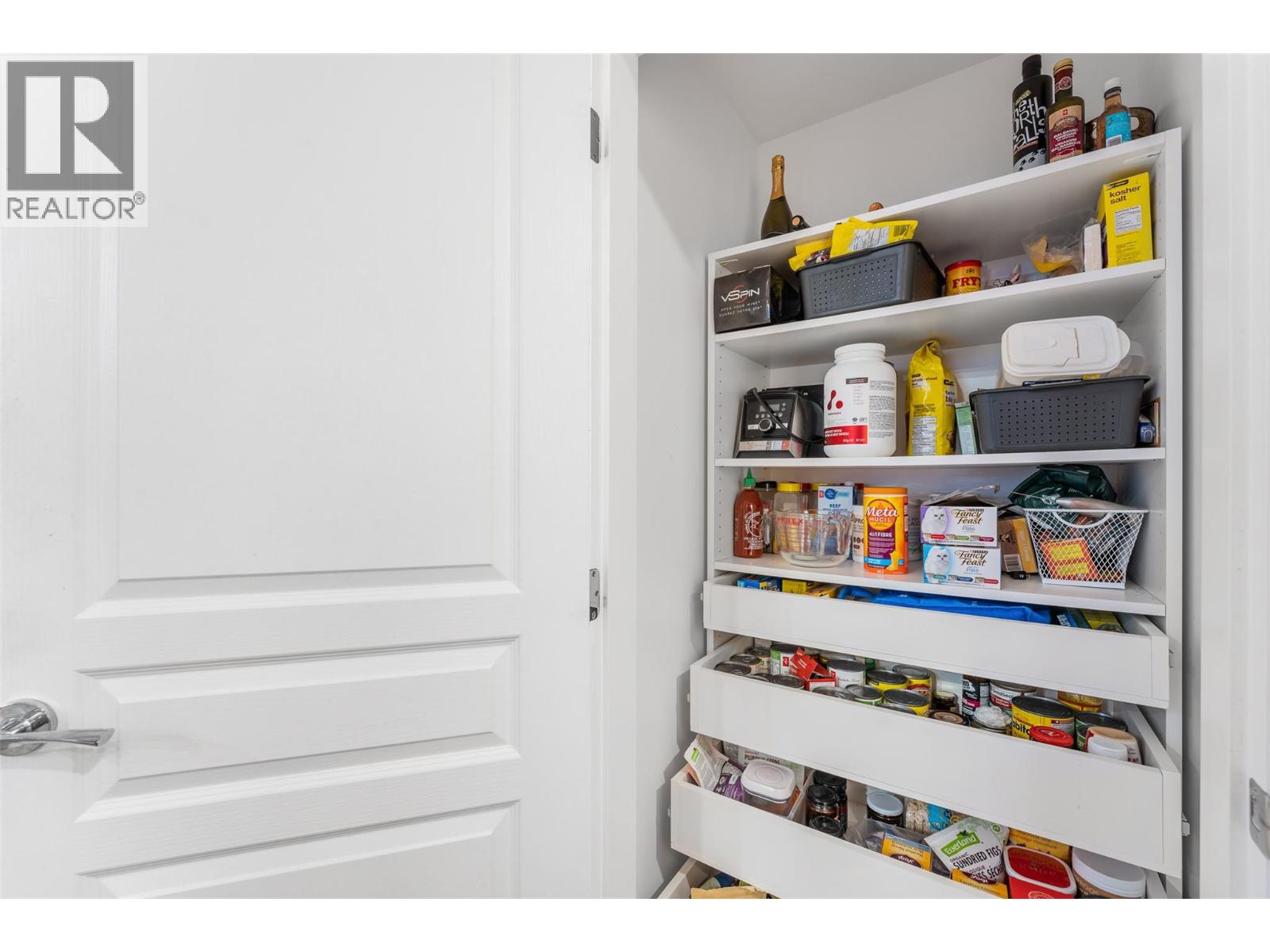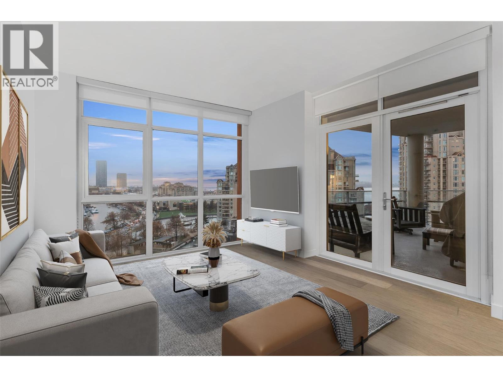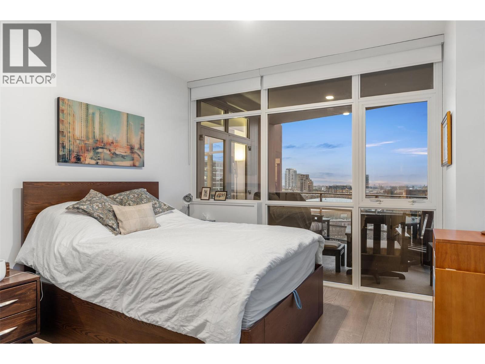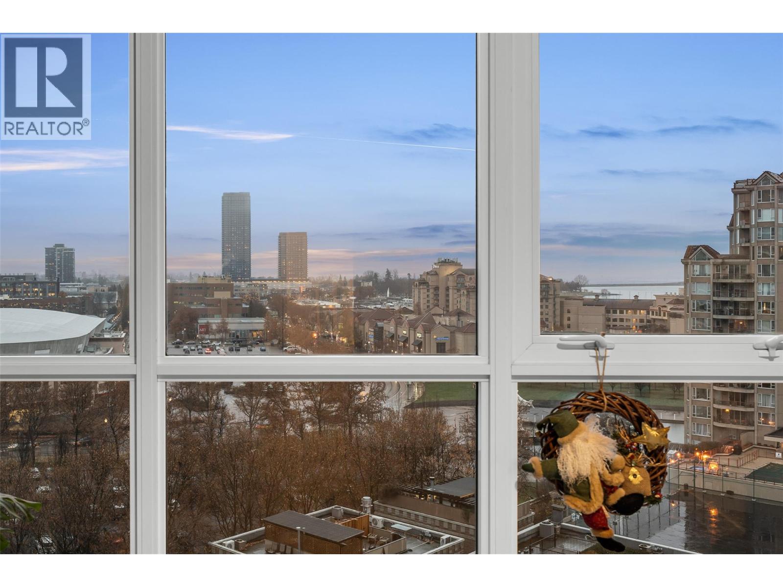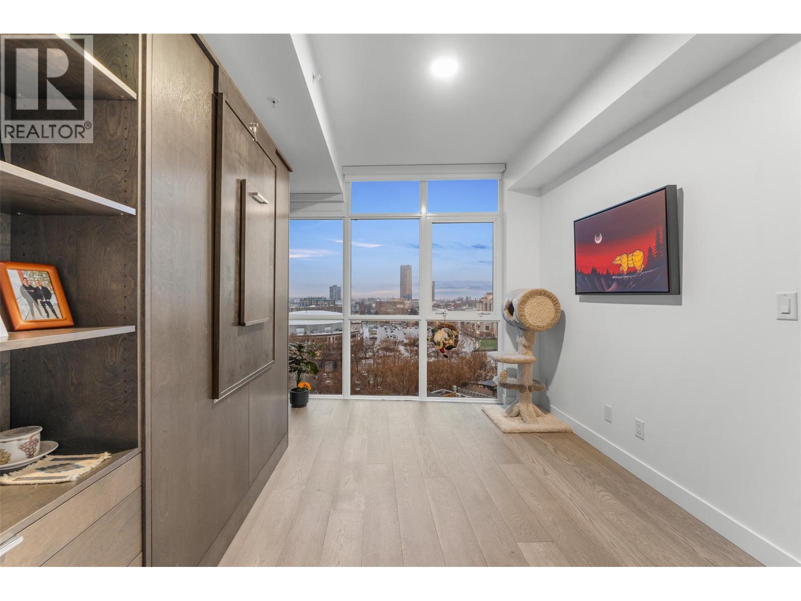Beautifully updated 2 bedroom, 3 bath residence set in the heart of downtown Kelowna, just steps from the waterfront, dining and cultural amenities. Framed by floor-to-ceiling windows, the home captures sweeping views of the lake, bridge, mountains and city skyline, creating an effortless connection to the Okanagan lifestyle. Thoughtfully updated in 2020, the home features custom closets, a redesigned pantry, modern Murphy bed with integrated desk, and new washer/dryer. Lutron smart lighting enhances the ambiance throughout. The contemporary kitchen is a standout with quartz countertops, a waterfall-edge island with seating for 4, soft-close two-tone cabinetry, and premium Whirlpool appliances including a gas range. The open-concept living and dining area flows seamlessly to a generous covered deck, an exceptional outdoor extension with gas, power, and panoramic views. The primary suite offers private deck access, a custom walk-in closet, and a spa-inspired 5-piece ensuite with a freestanding tub positioned before a wall of glass. A well-appointed guest suite includes a walk-through closet and its own 4-piece bath. A sliding-door den, ample in-suite storage, and central A/C add to the comfort. Residents enjoy access to various amenities including a plunge pool, gym, and meeting room. 2 parking stalls. With its refined finishes, thoughtful upgrades, and unmatched walkability, this home offers the best of downtown living paired with gorgeous Okanagan views.